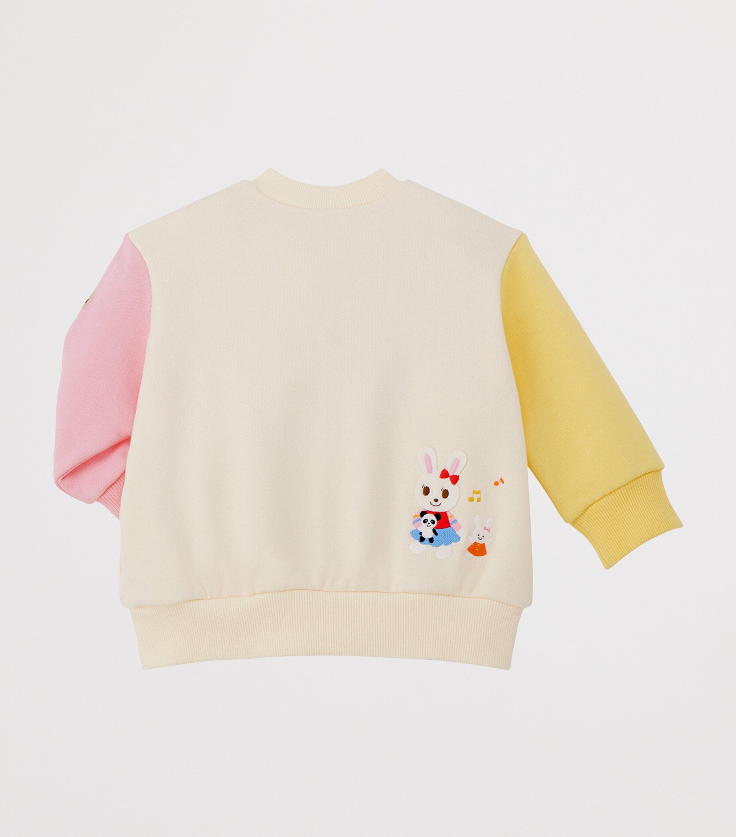 Bursting with colour and charm, this Miki House cotton sweatshirt is a celebration of playtime. The front features intricate embroidered animals and a colourful patch and embroidery design depicting a circus tent and playful towers. Finished with mismatched sleeves and a three-tone design, it’s a fun, standout piece for growing wardrobes. Two musical bunnies on the back complete the whimsical look.