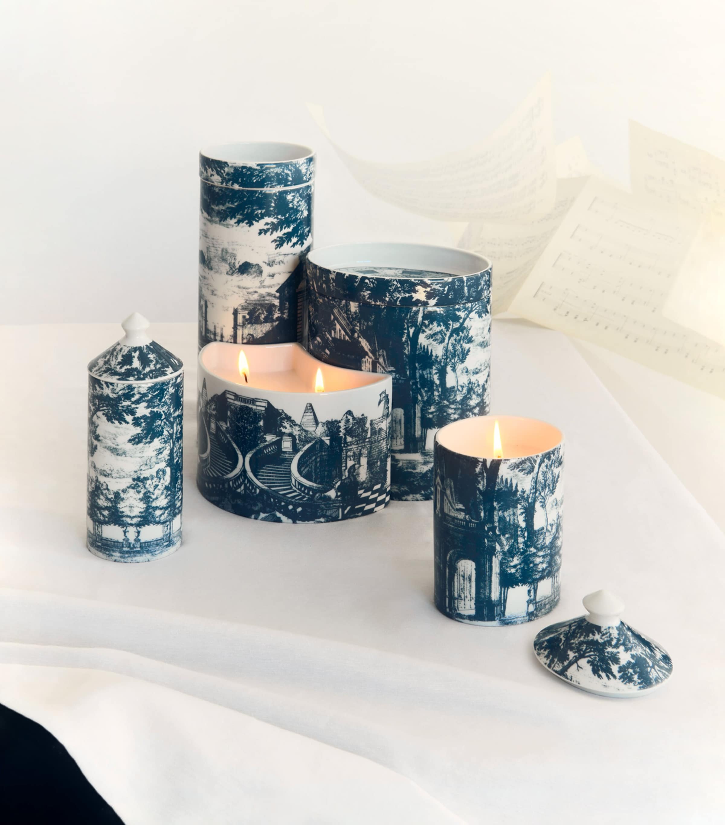 With a colour palette evocative of traditional blue and white pottery, the Giardino Settecentesco candle collection by Fornasetti presents fantastical landscapes in the most elegant of ways. As is often the case with the Italian brand, architectural details abound across the ceramic vessels, while wax scented with the Giardino Segreto fragrance – a mystical and fruity scent – creates an olfactory atmosphere to match the visual feast.