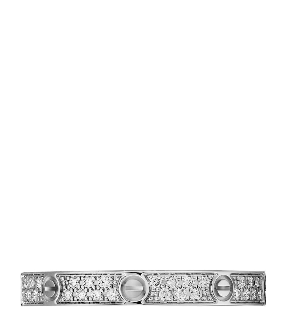 A symbol of everlasting love embraced by history’s most famous couples. The LOVE collection is arguably Cartier's most recognisable design; conceptualised by legendary jeweller Aldo Cipullo in 1969, it has since become an icon. It’s prized for its symbolism, evoking an eternal bond with screw details that suggest the wearer is locked into love. These romantic notions are here translated into an 18-karat white gold ring featuring 72 brilliant-cut diamonds.