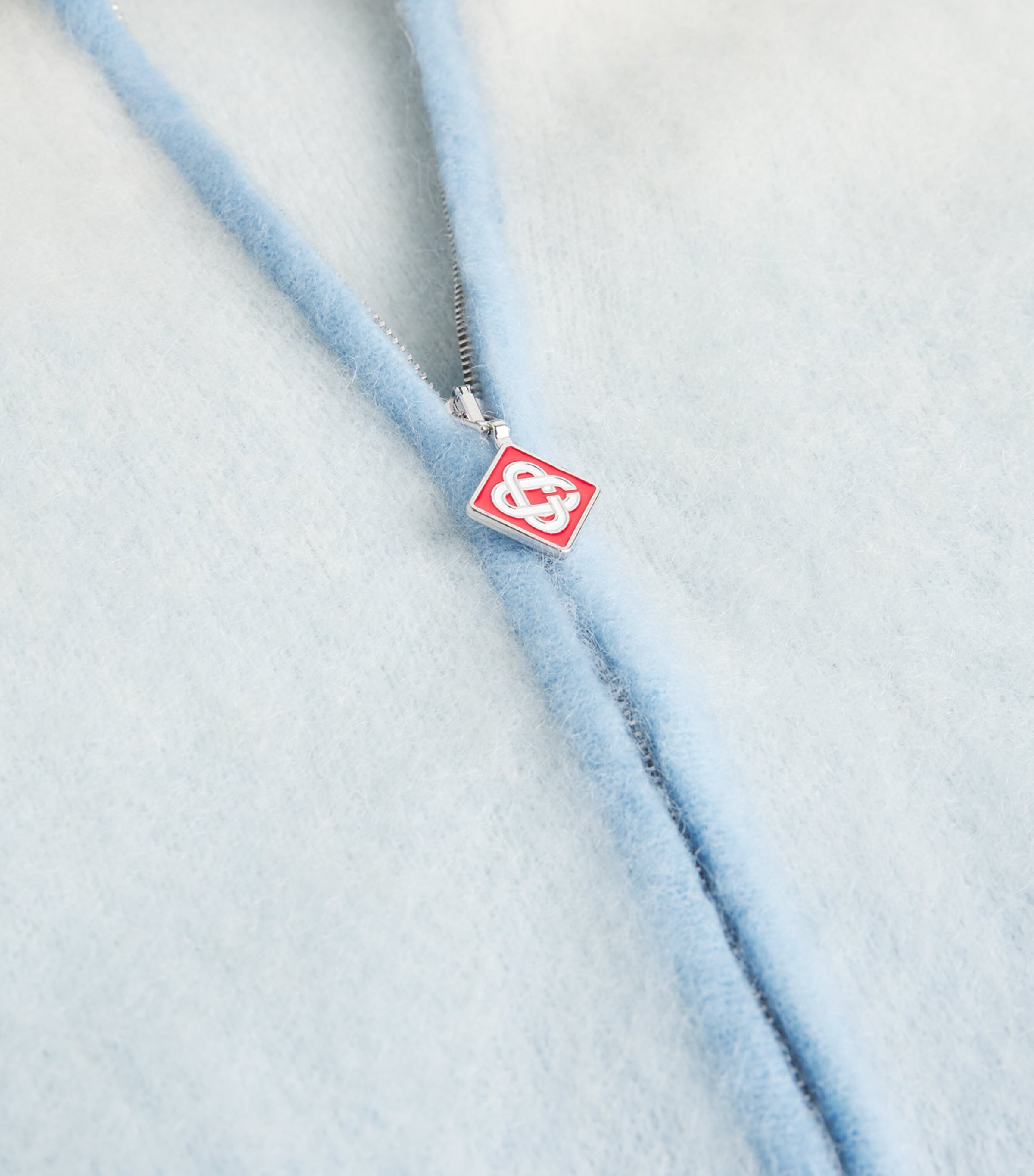 Casablanca’s usual palette, evocative of sunbaked terracotta and tennis lawns, falls in favour of a light-hued gradient inspired by a snow-filled twilight scene for this knitted jacket. Versatility is woven into every fibre, lending this piece naturally to layered styling, owed to a shawl collar that forms a high neckline when zipped, bringing added warmth on colder days.