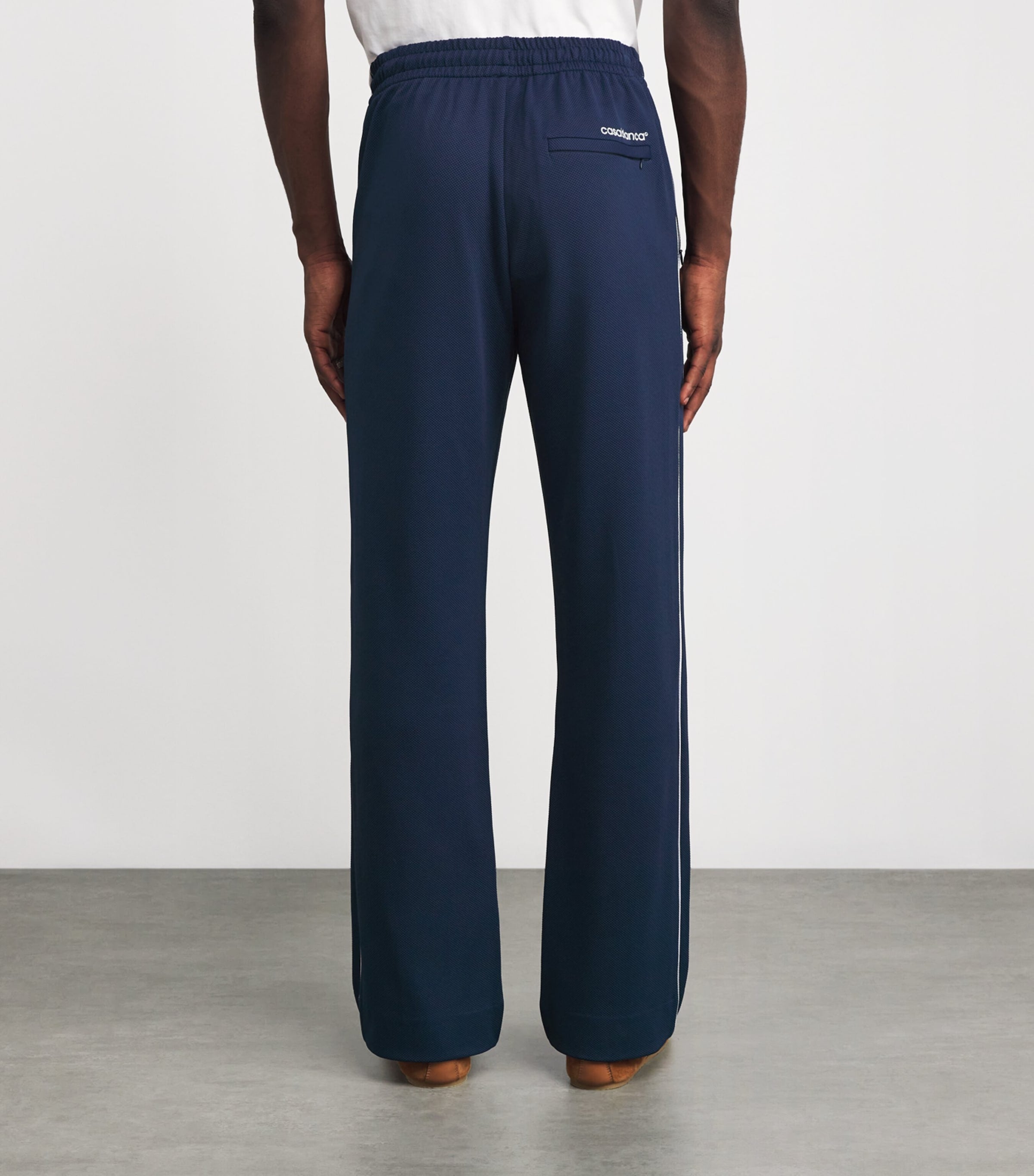 Casablanca's designs are grounded in après-sport styling, drawing inspiration from the pieces that effortlessly crossed over from the court to the country club. Here, the brand presents a unique rendition of track pants, utilising a rounded piqué fabric to create textural intrigue and a relaxed, breathable handle. Note the use of tasteful piping along the side, complementing the back logo embroidery.