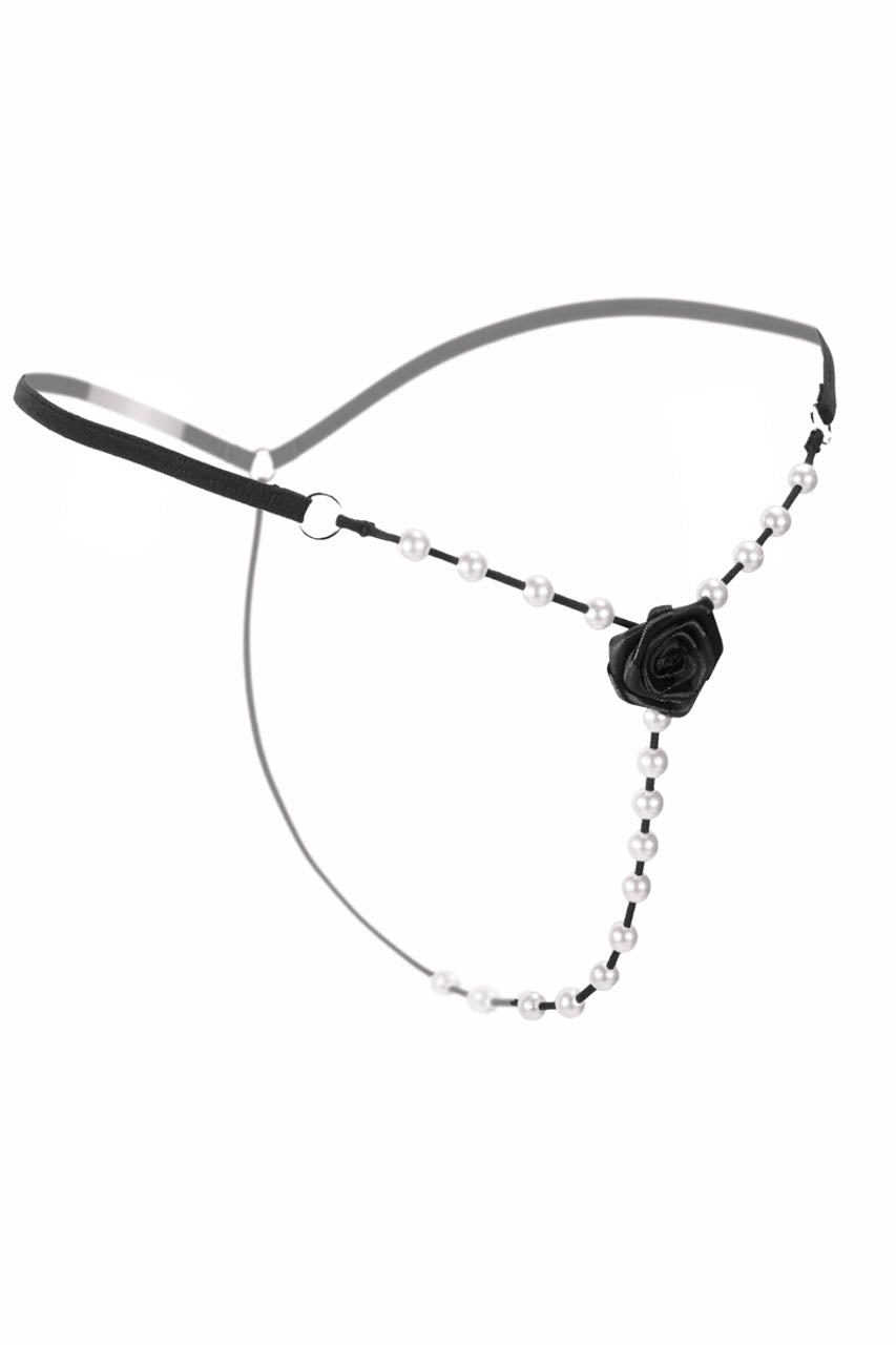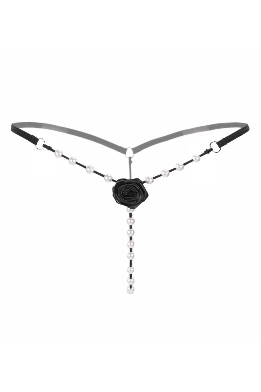 This ultra sexy, thong panty features a satin rose applique, pearl trim details, and o-rings.