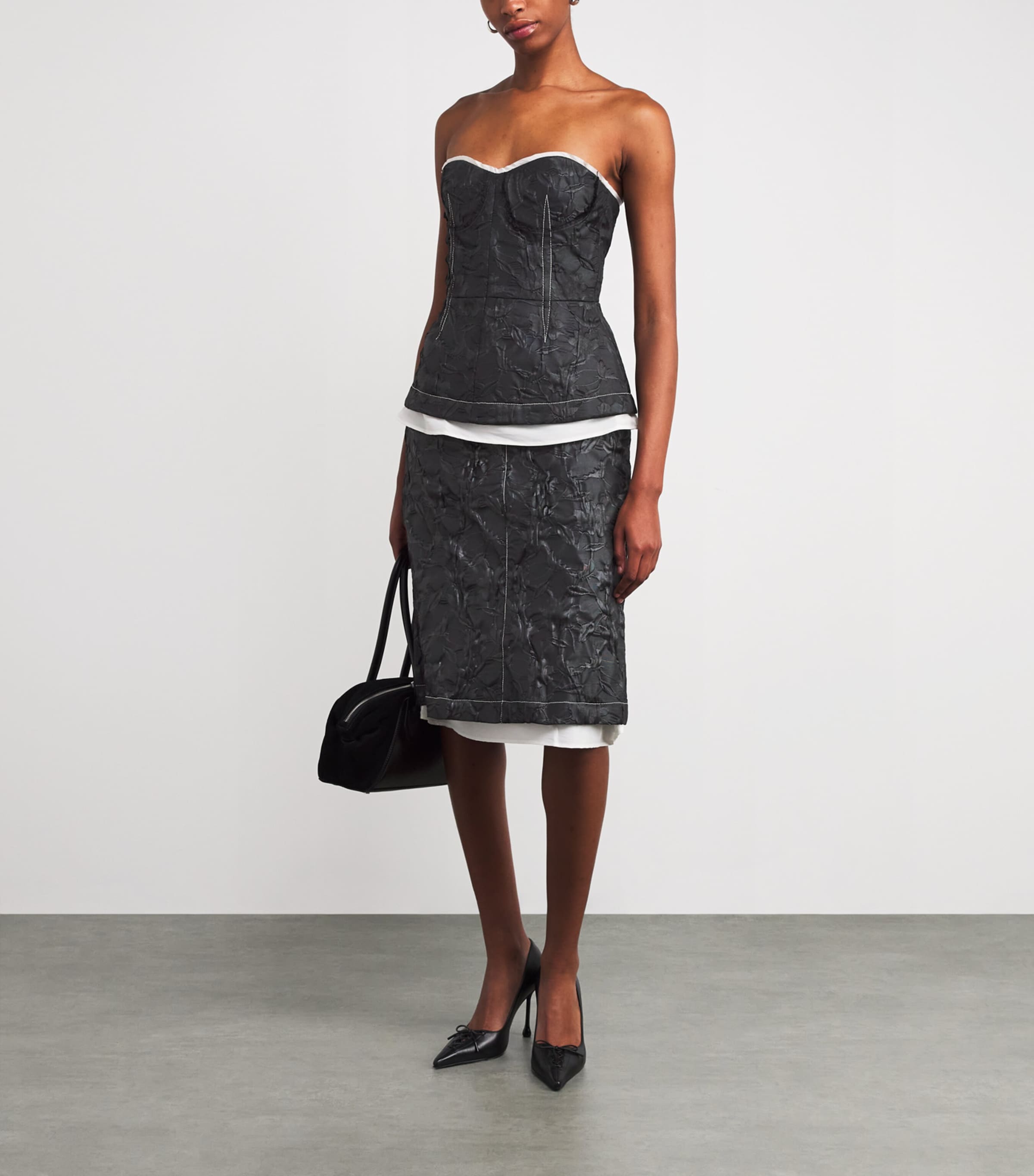 Pair it with the matching skirt to complete the ensemble. Jonathan Simkhai founded his eponymous label in 2010, drawing inspiration from architectural forms and sculptural shapes. Customised and unique fabrics are a hallmark of the brand, as seen in the Autumn/Winter 2025 collection. The Zander bustier top, for instance, is crafted from a waxed floral jacquard, creating an interesting three-dimensional texture against a flared silhouette.