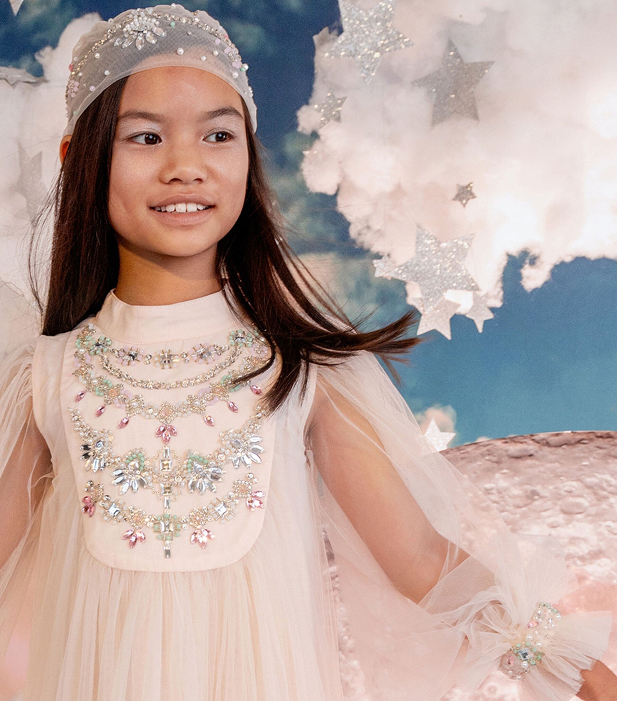 Tutu Du Monde captures a world of storybook wonder with the Crown Jewel dress – a dazzling piece where imagination takes centre stage. Crown-like jewels sparkle across the chest, while delicate, translucent sleeves and soft tulle layers create a floaty, magical silhouette that moves like a dream. Perfect for adventures both real and make-believe, it’s a celebration of creativity, play and pure joy.