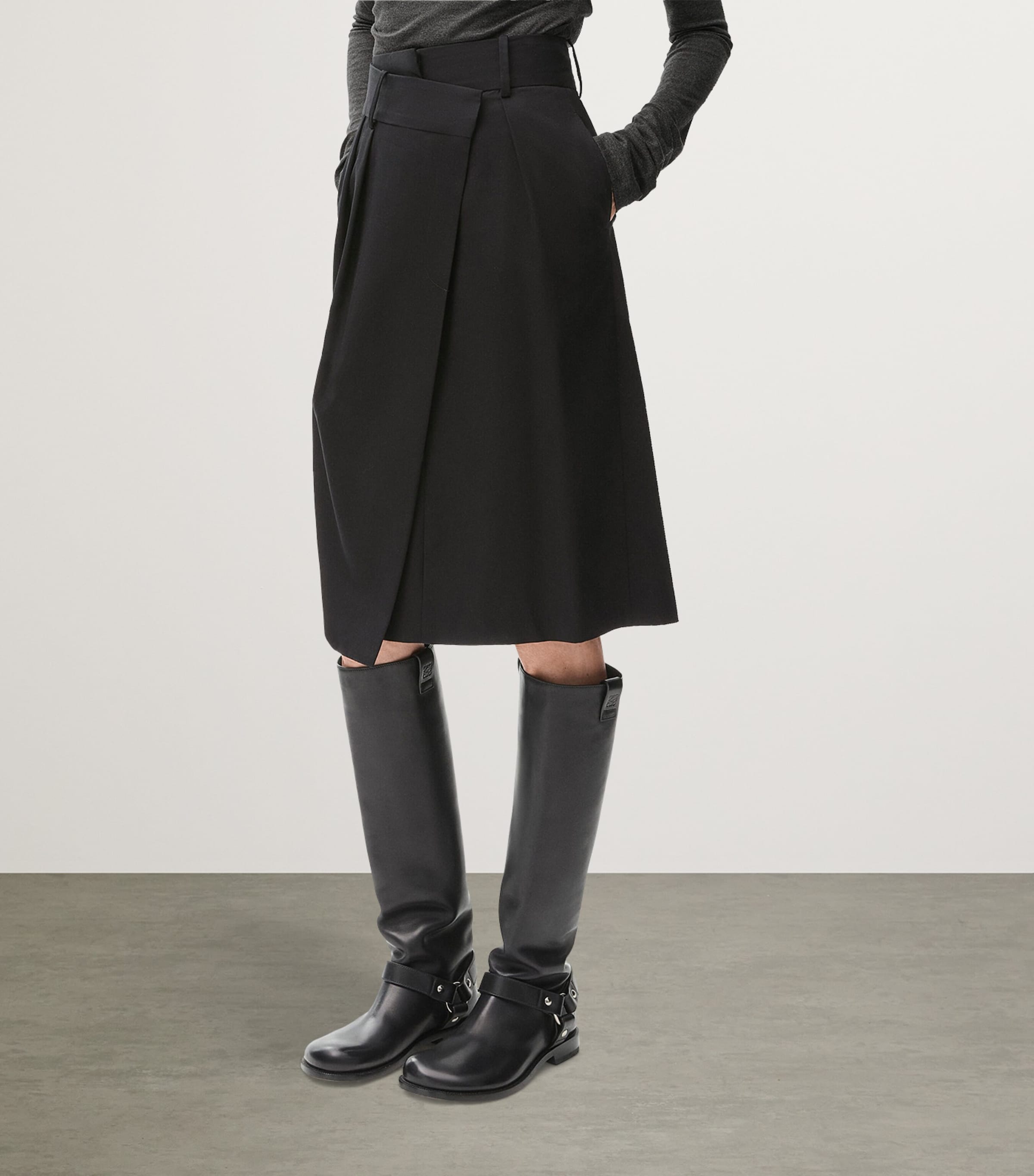 With its architectural tailoring and experimental silhouettes, LOEWE’s offerings continue to blend creativity with precision, as exemplified by this skirt. Crafted from a lightweight and soft cotton-silk gabardine, the asymmetric wrapped construction adds a contemporary elevation which, when paired with the high waist and A-line profile, creates a sophisticated option for seasonal dressing.