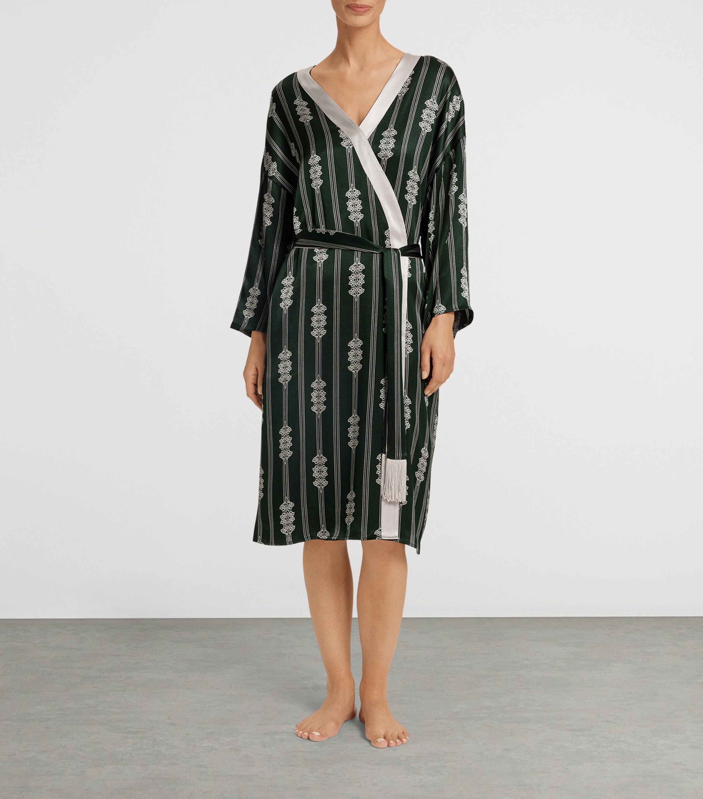 Crafted with care and attention to detail, the Indra robe from HANRO features fine contrasting stripes embellished with intricate patterns for an ornate effect. The flowing silhouette is cinched with a tasselled tie belt, adding a decorative yet understated accent.