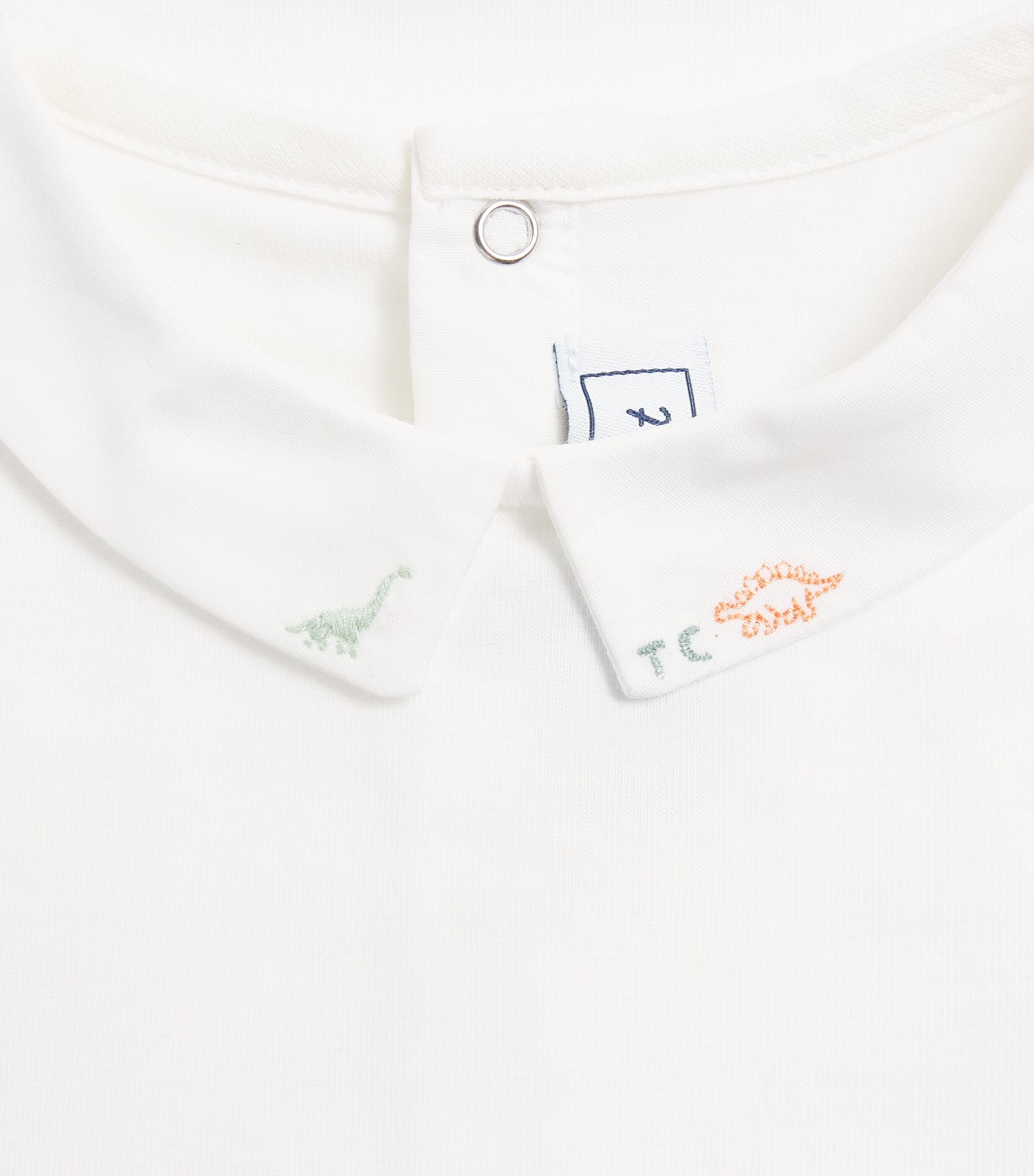 Though your baby may still be learning how to speak, Tartine et Chocolat encourages you to add ‘palaeontologist’ to their list of words with this charming bodysuit. Woven from stretch cotton for comfortable wearability, this piece is designed with a classic collar, which is intricately embroidered with a brachiosaurus and stegosaurus on either side.