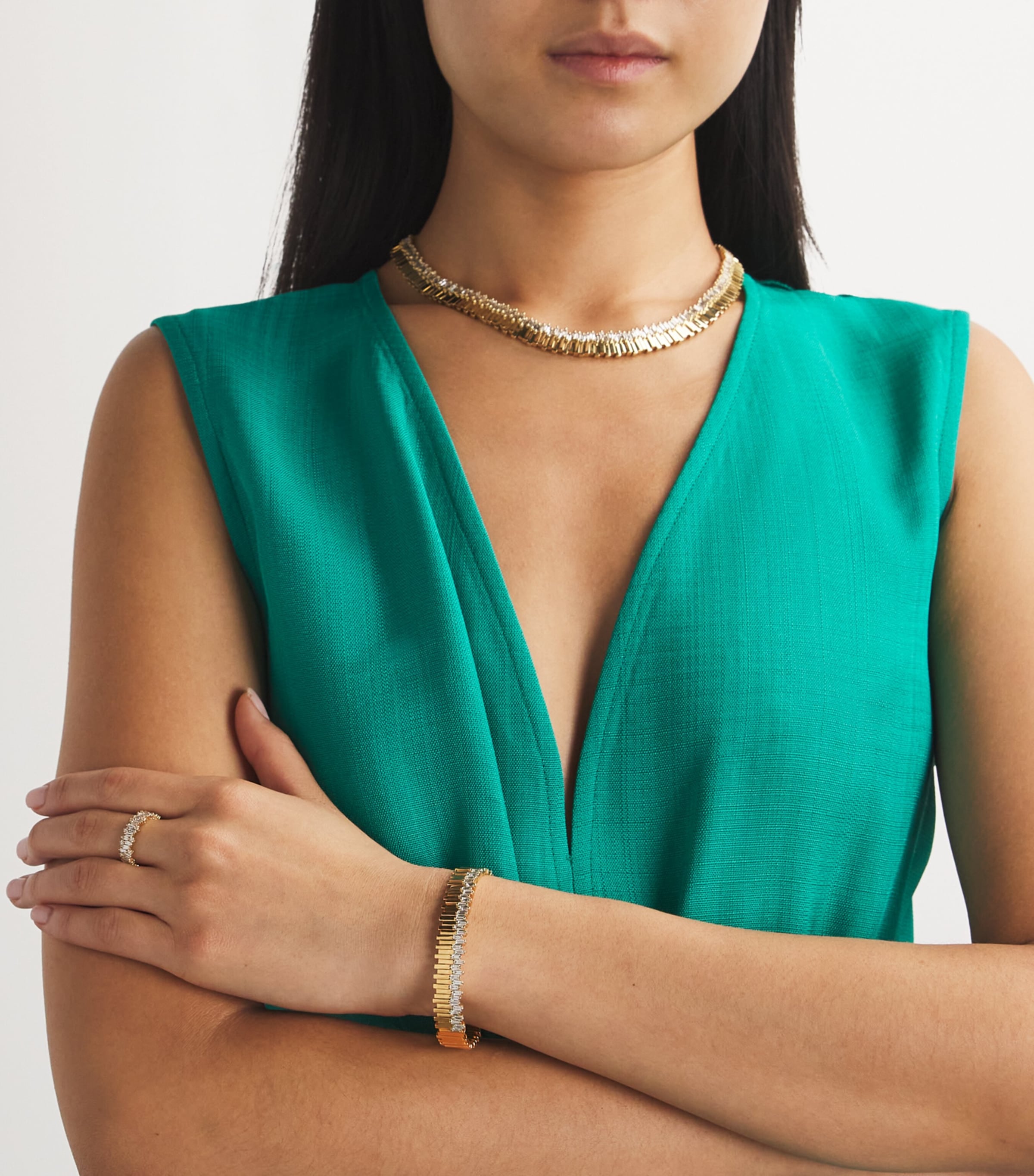 With the Golden Age bangle, Suzanne Kalan redefines one of her brand signatures. And what a signature it is: Kalan’s baguette-cut stones have become something of a sensation in the contemporary jewellery world, beloved for their unique shape and haphazard arrangements. Here, the stones are joined by warm, crisp forms rendered in yellow gold, creating the same effect but for those who prize understatement.