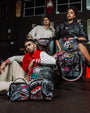 Dimensions: 18" x 6" x 11.5" • Front zipper pocket • Side pockets • Zippered Stash pocket • Separate velour sunglass compartment • Ergonomic mesh back padding • Adjustable Straps for custom sizing • Gold zippers with metal hardware • Metal "Sprayground Authentic" badge • Slide through back sleeve connects to carry-on luggage to free your hands