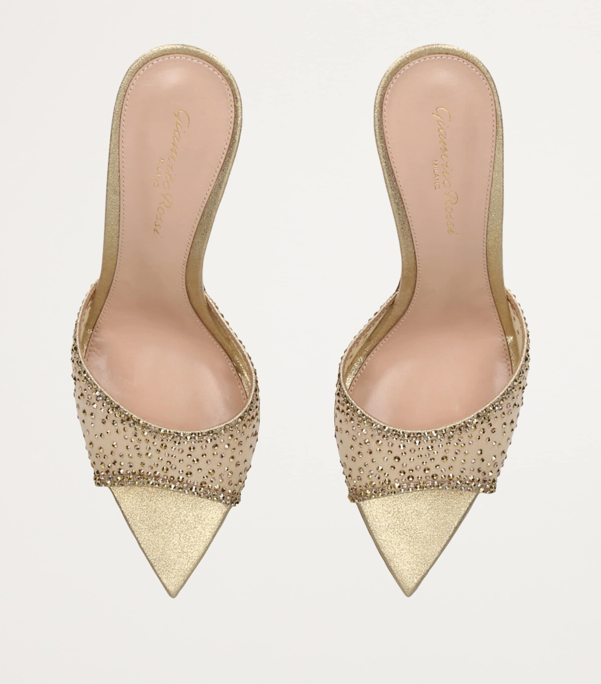 Gianvito Rossi reinterprets a classic silhouette with the sparkling Rania mules, embellished with exquisite crystals over the upper. Perched atop a flattering stiletto heel, the delicate shoe is characterised by a slip-on style and sophisticated pointed toe.