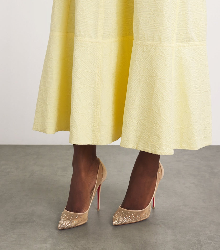 There’s no questioning the glamorous appeal of Christian Louboutin’s Follies Strass pumps thanks to an abundance of striking features that beg to be seen after dark. Beginning at the sparkling embellished toe, the profile curves sensually upwards with swathes of tulle-like mesh before culminating in a suede stiletto heel. It’s all poised atop a lacquered red sole – a detail that ensures the pair is nothing short of iconic.