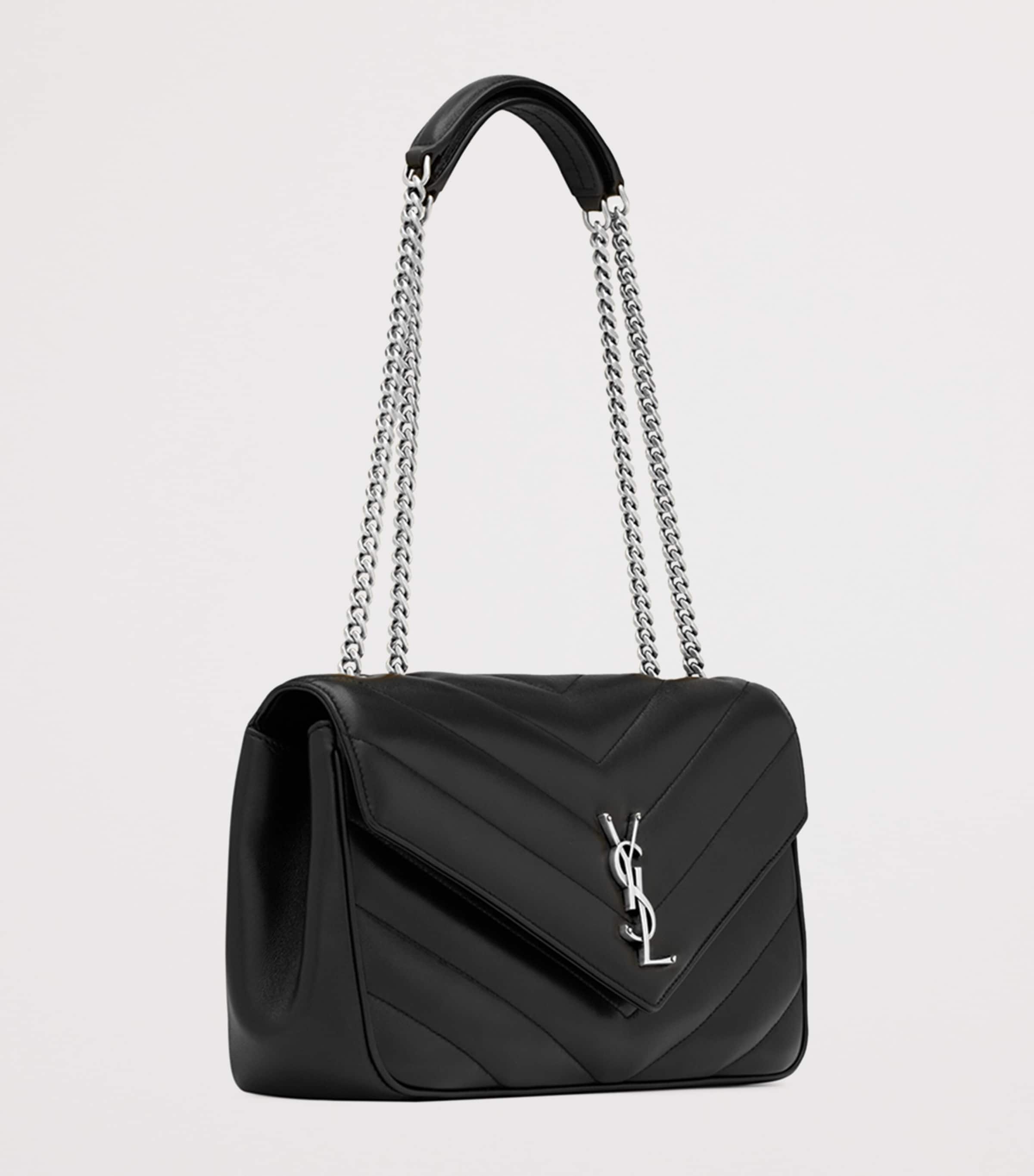The chevron-quilted topstitching is a Saint Laurent signature.
