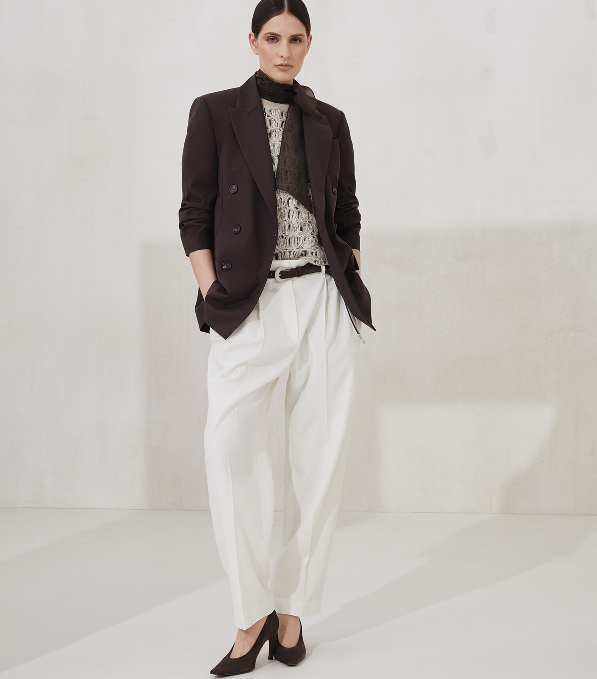 With its structured silk fabrication and fluid drape, this sleeveless top brings a modern edge to timeless tailoring. The pussybow neckline ties gently at the collar, while monili-trimmed accents add a light-catching finish. A discreet shoulder button closure and silk-blend lining refine the piece with Brunello Cucinelli’s hallmark attention to detail.