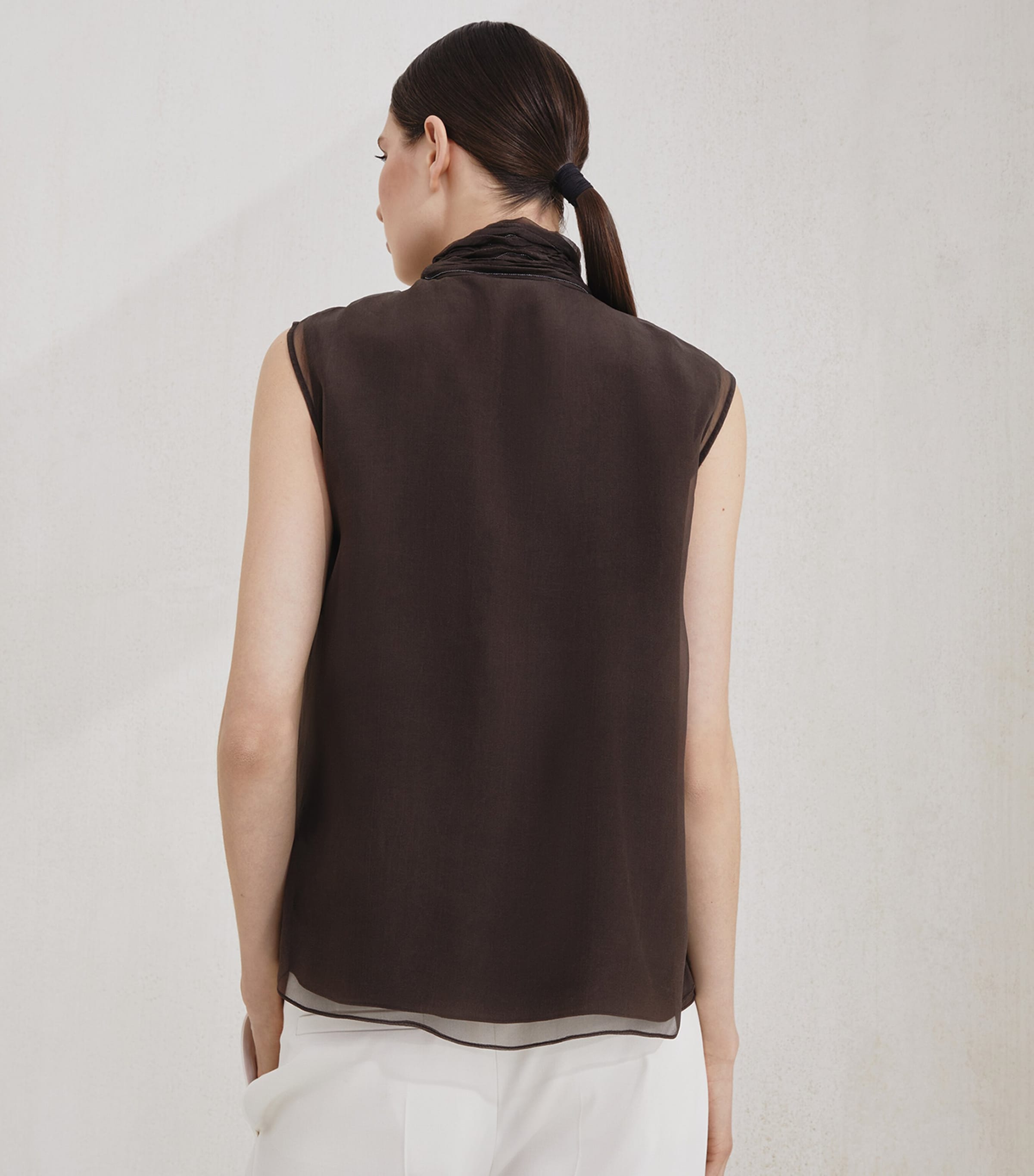 Brunello Cucinelli Brown Silk Pussybow Sleeveless Top