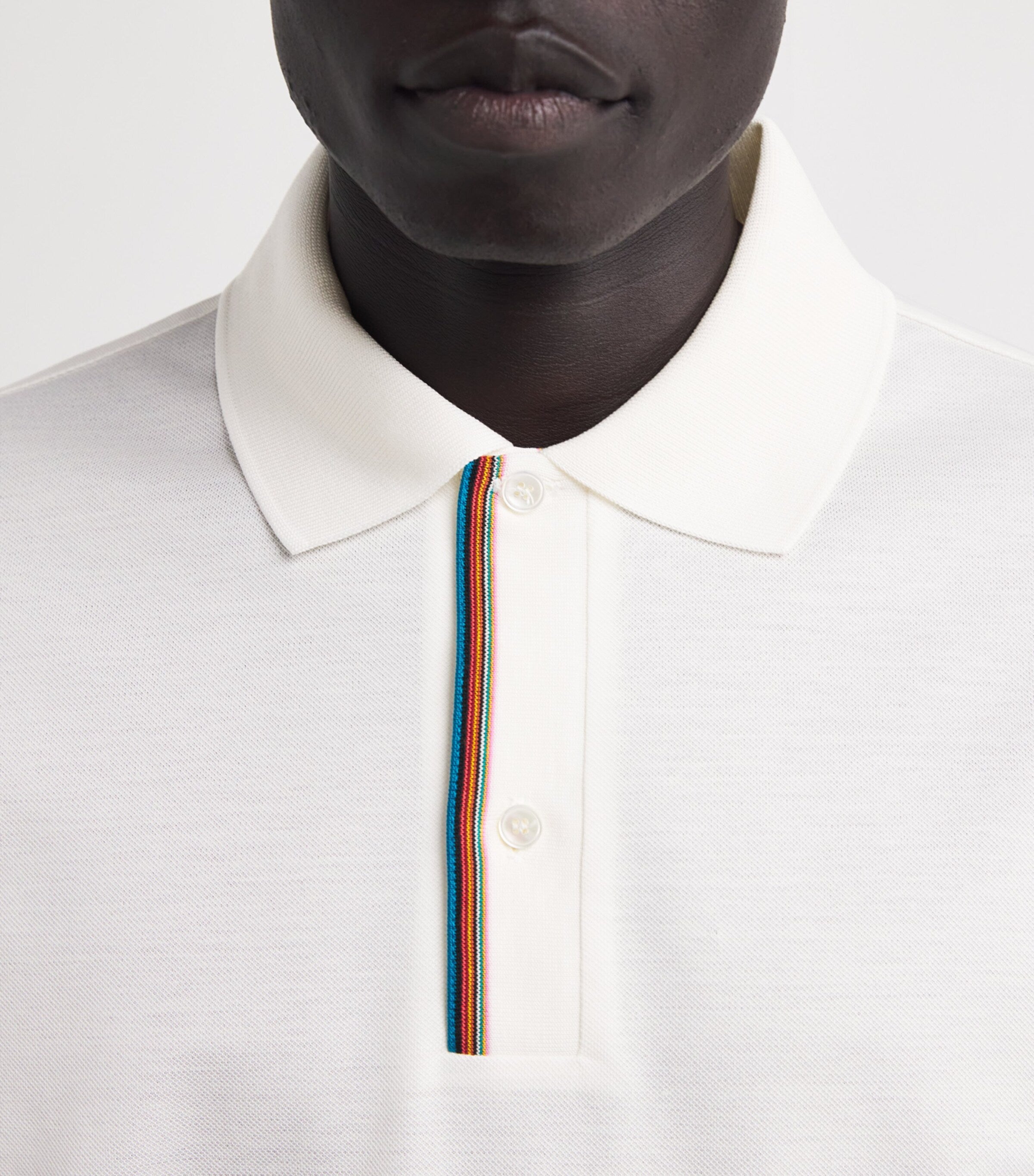 Back in the 1970s, Paul Smith was experimenting with different coloured yarns by layering them on cards to create stripes, thus giving birth to its most widely-recognised motif: the Signature Stripe. Here, it’s incorporated on the placket of this cotton polo shirt, leaning into the label’s distinct playful spirit.