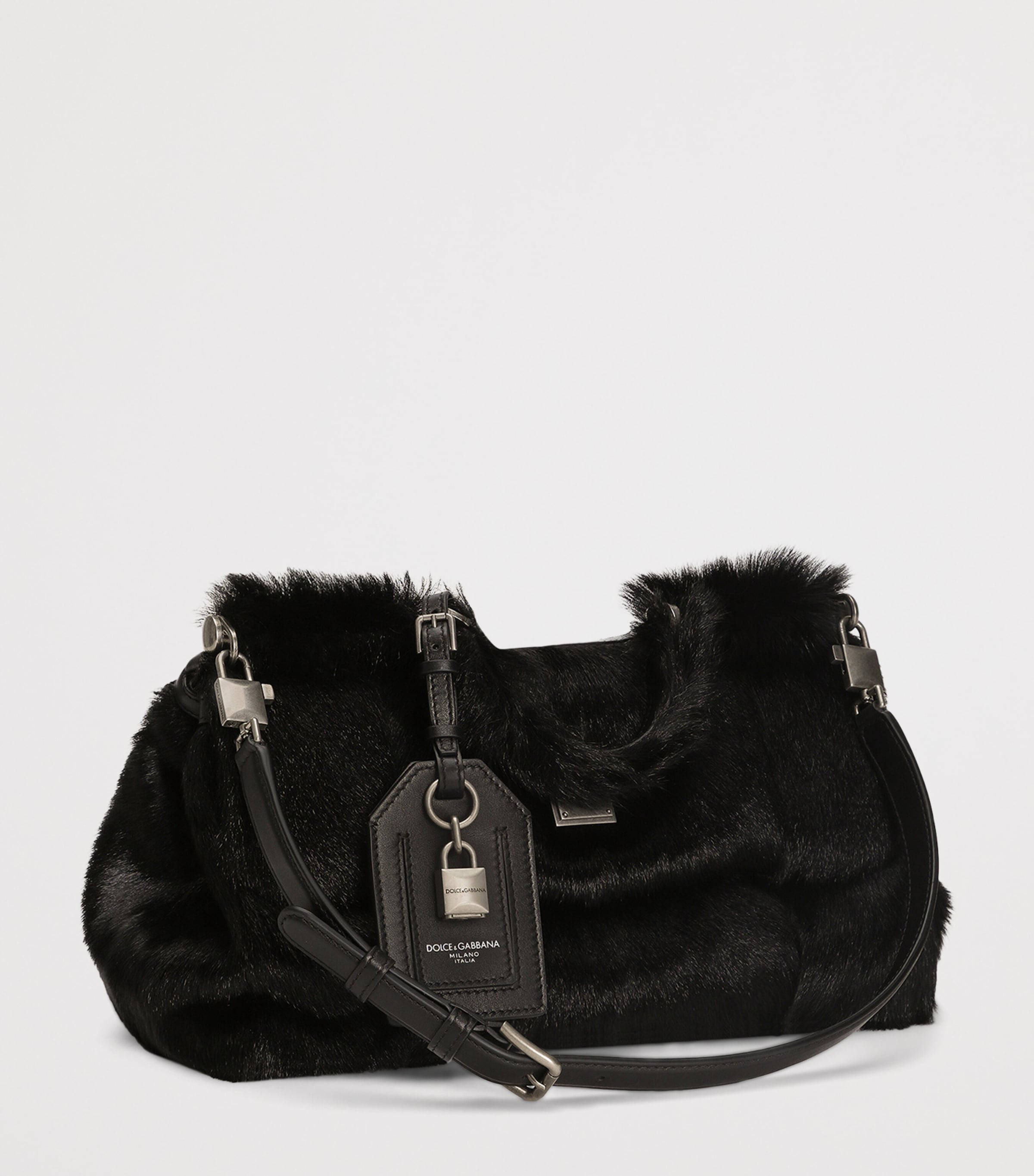 Offering a bolder take on the Sicily silhouette, this My Sicily style from Dolce & Gabbana embodies elegance and functionality, crafted from fuzzy kid goat hair with silver-tone flourishes. Its sleek design and luggage tag detail invite international and domestic travel, resting comfortably over the shoulder or dangling loosely in hand to accommodate the movements of fashion aficionados who live life on the go.