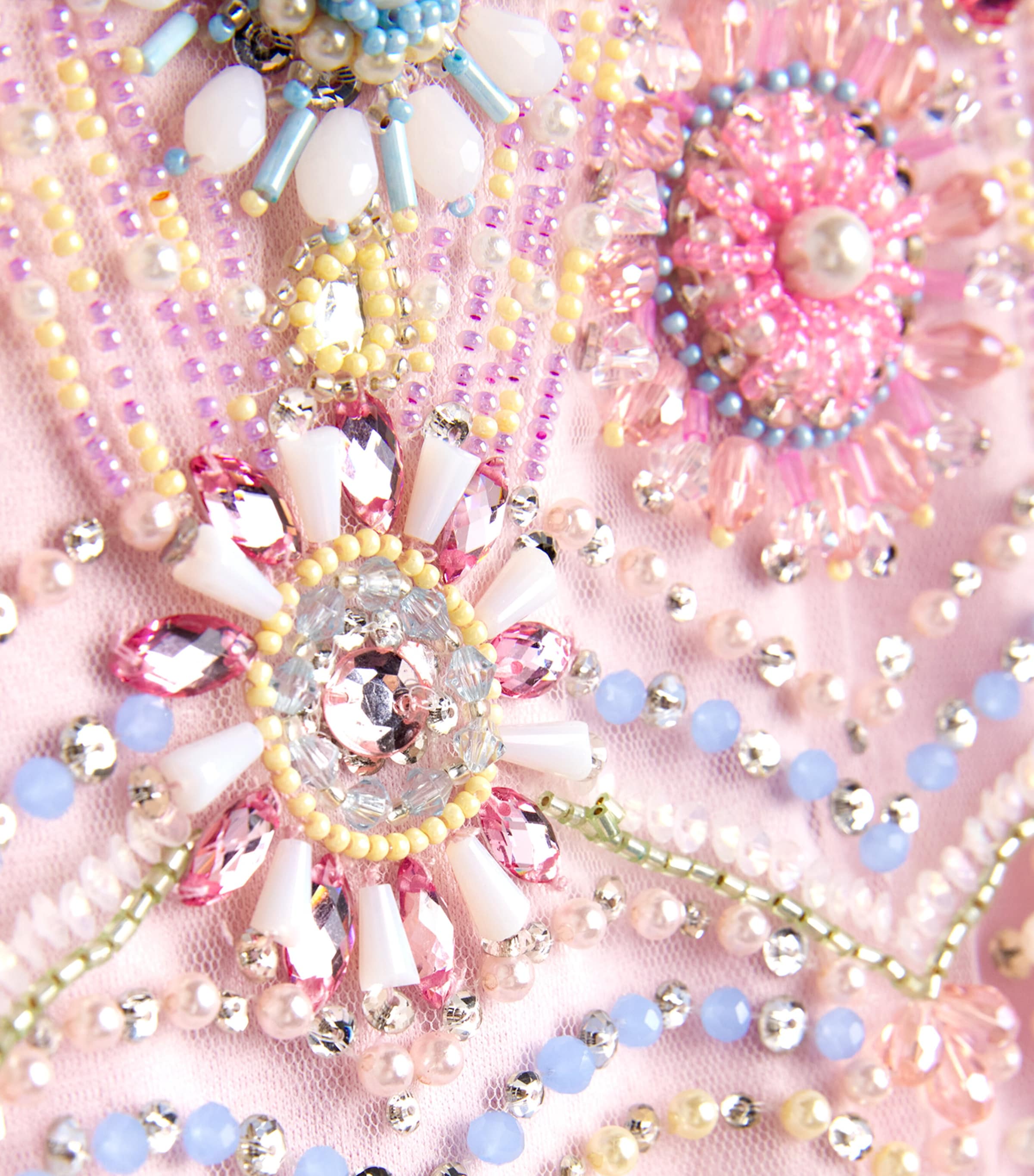 Capturing the magic of the natural world with its ballet costume-inspired designs, Tutu Du Monde’s Floral Reverie collection echoes blooming gardens at dawn. Blossoming from the line, the Floral Fête tutu dress showcases a cascading feathered tulle skirt and a plethora of beads, faux pearls and gems that twinkle under the sunlight.