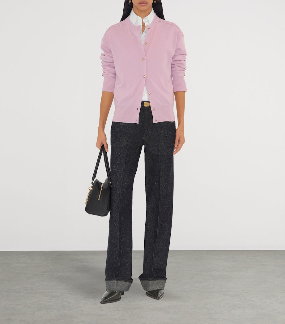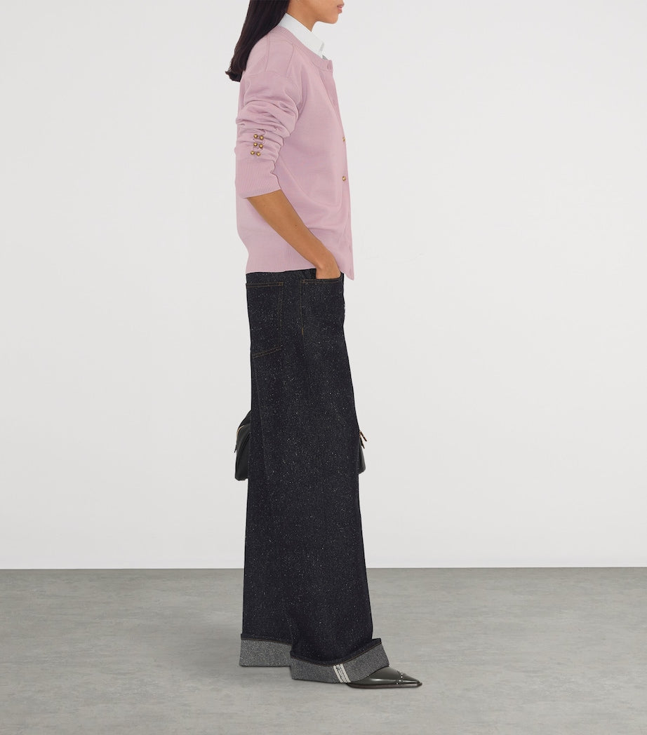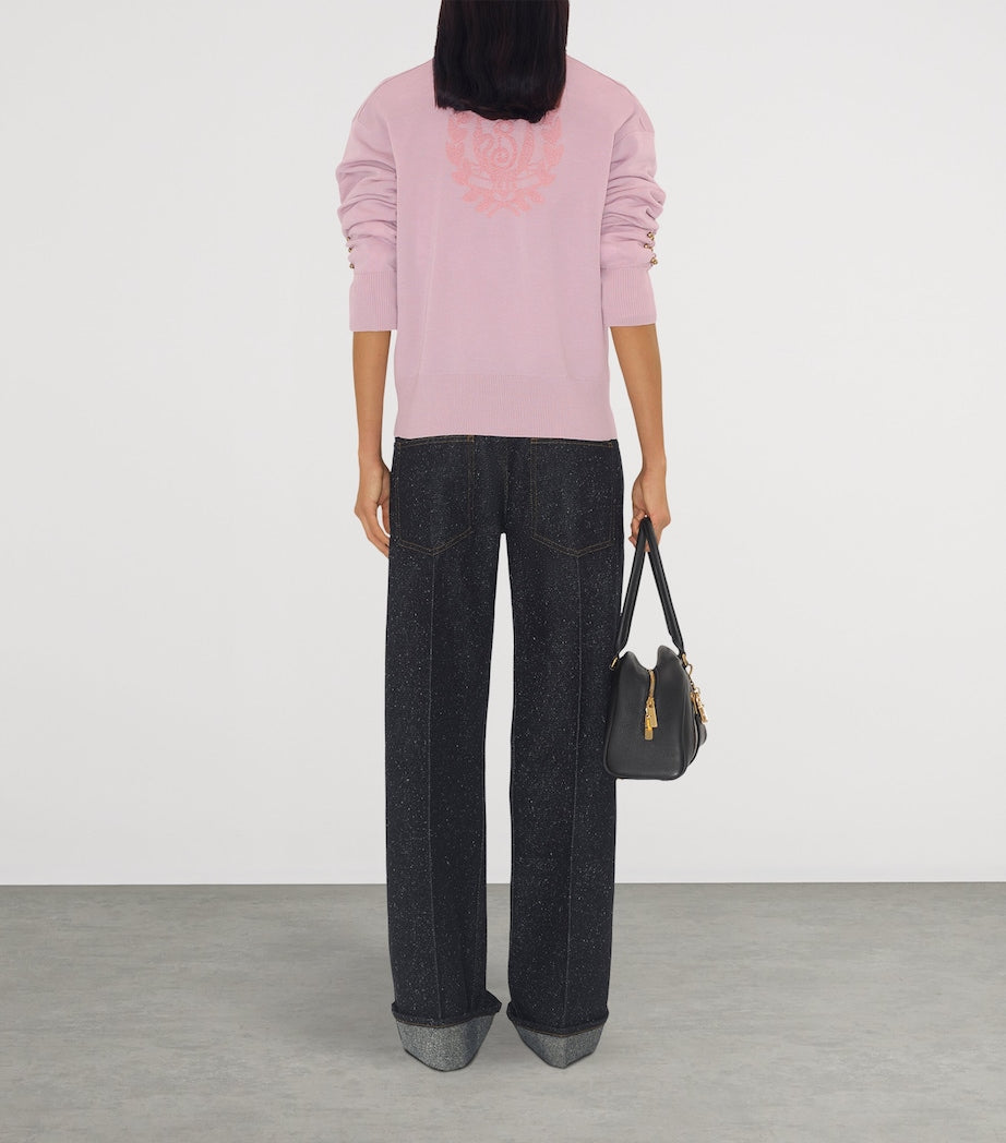 This lightweight cardigan puts a modern spin on Burberry’s heritage style codes. The front of the wool piece is unadorned, but the back spotlights a silk-blend embroidered crest formed from the classic B Shield as well as a garland of oak leaves and a banner with the date the House was founded.