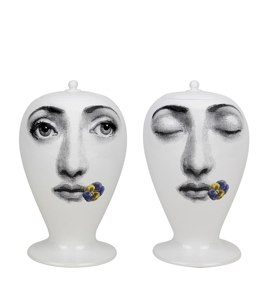 Crafted in Italy from the finest porcelain, this Fornasetti vase is a beautifully eccentric way to display your favourite flowers in your home. The rounded shape showcases a design that pays tribute to the expressive face of opera singer and Fornasetti muse, Lina Cavalieri, here seen in a serene closed-eye pose with a viola between her lips.