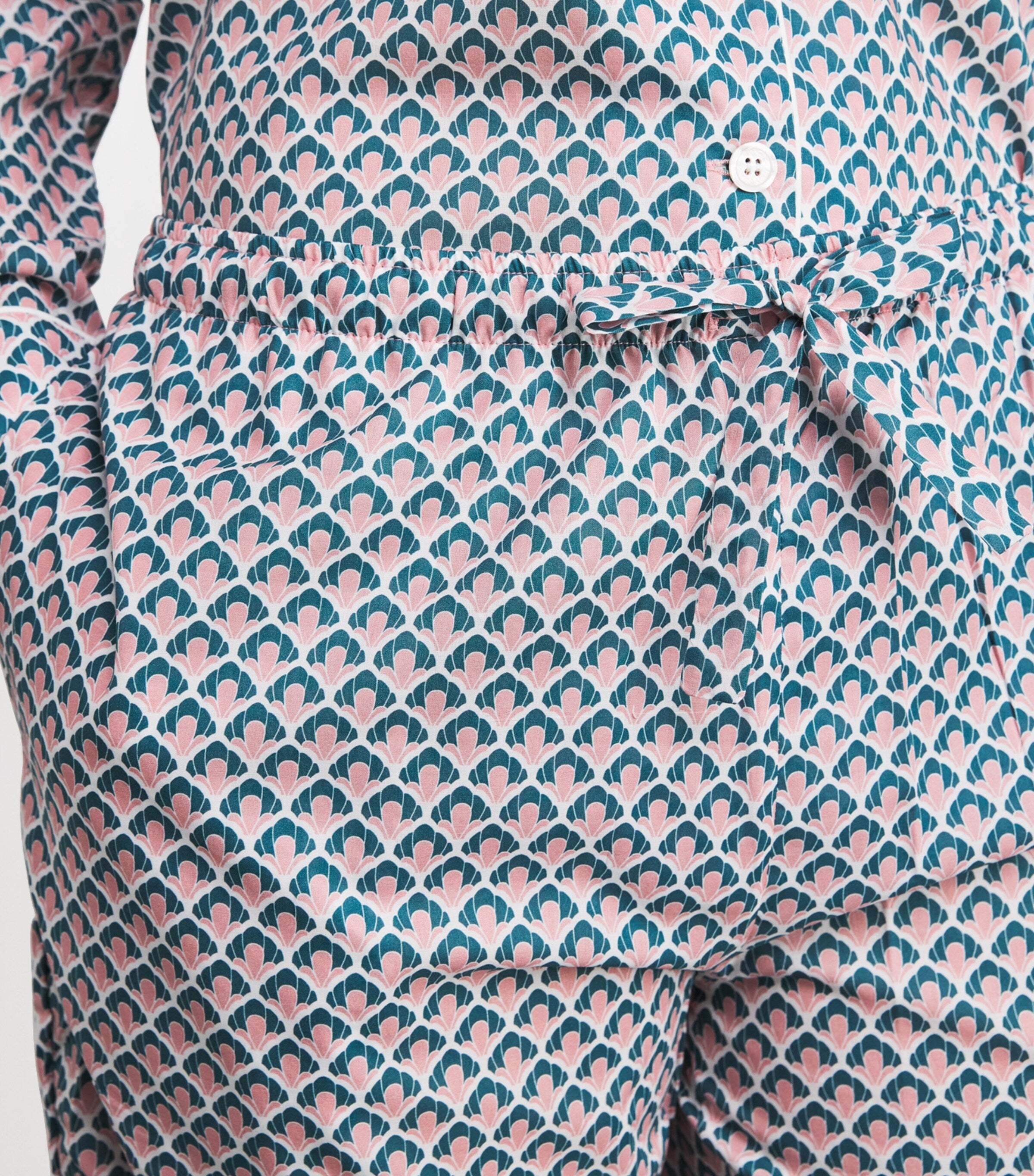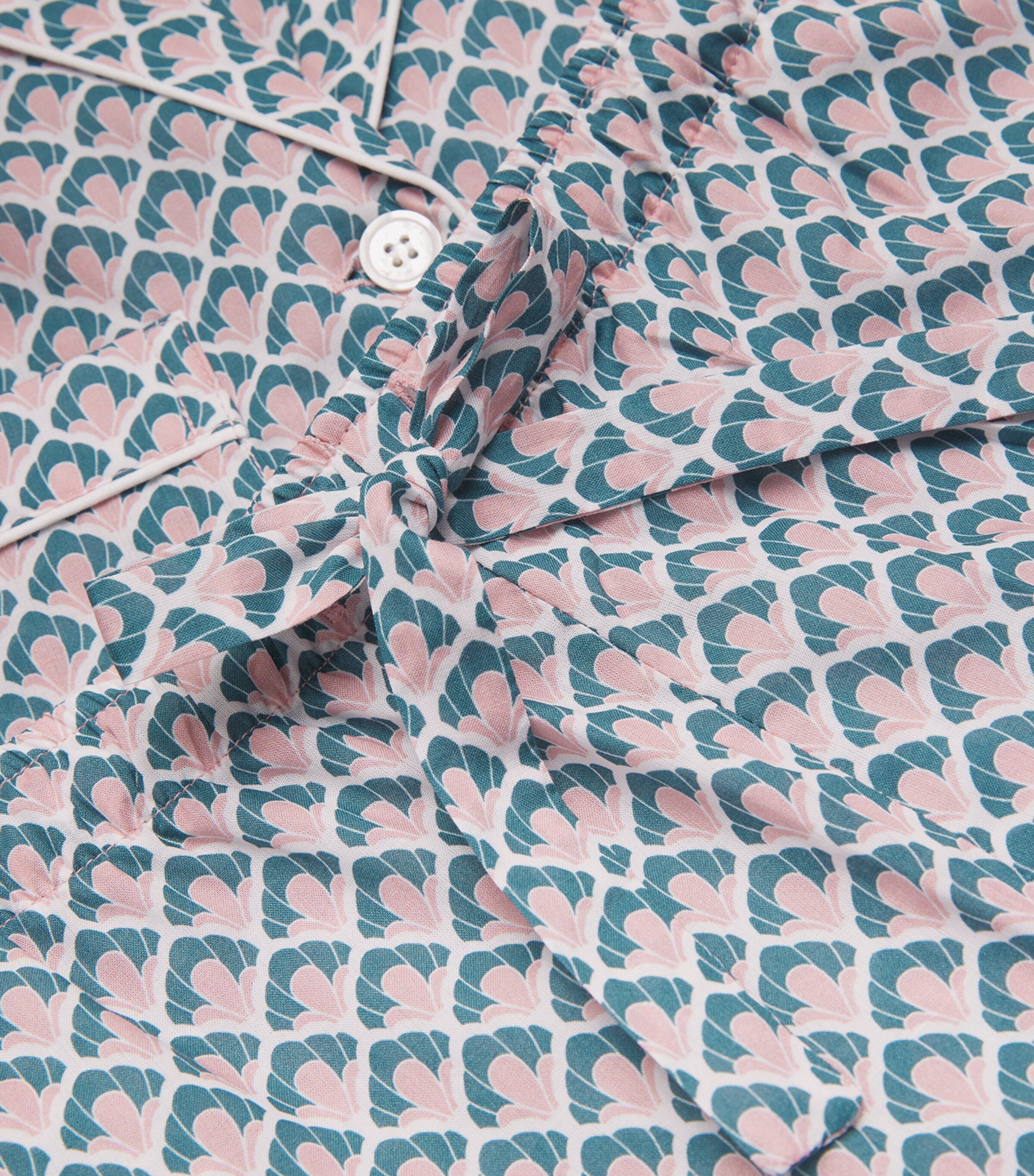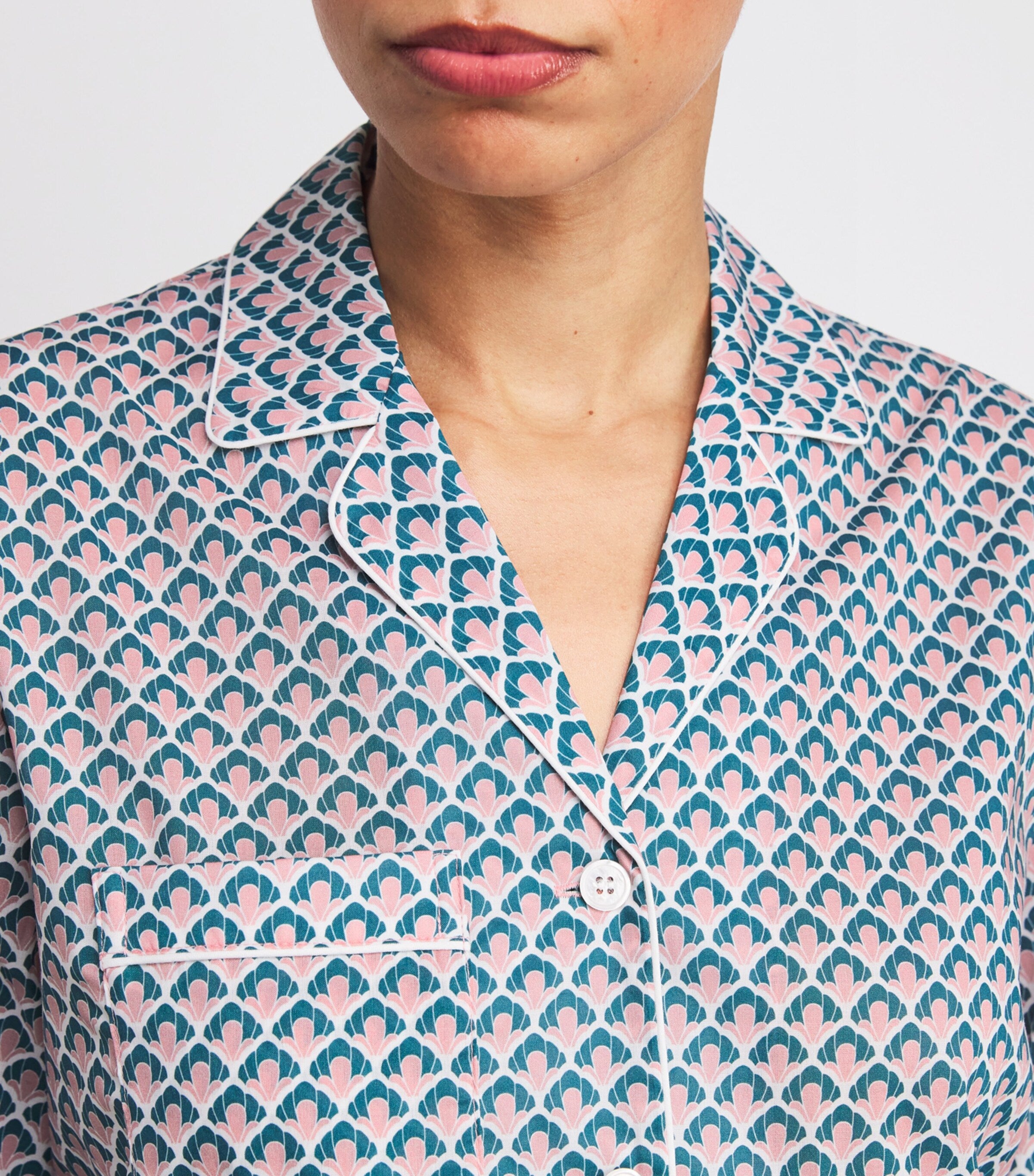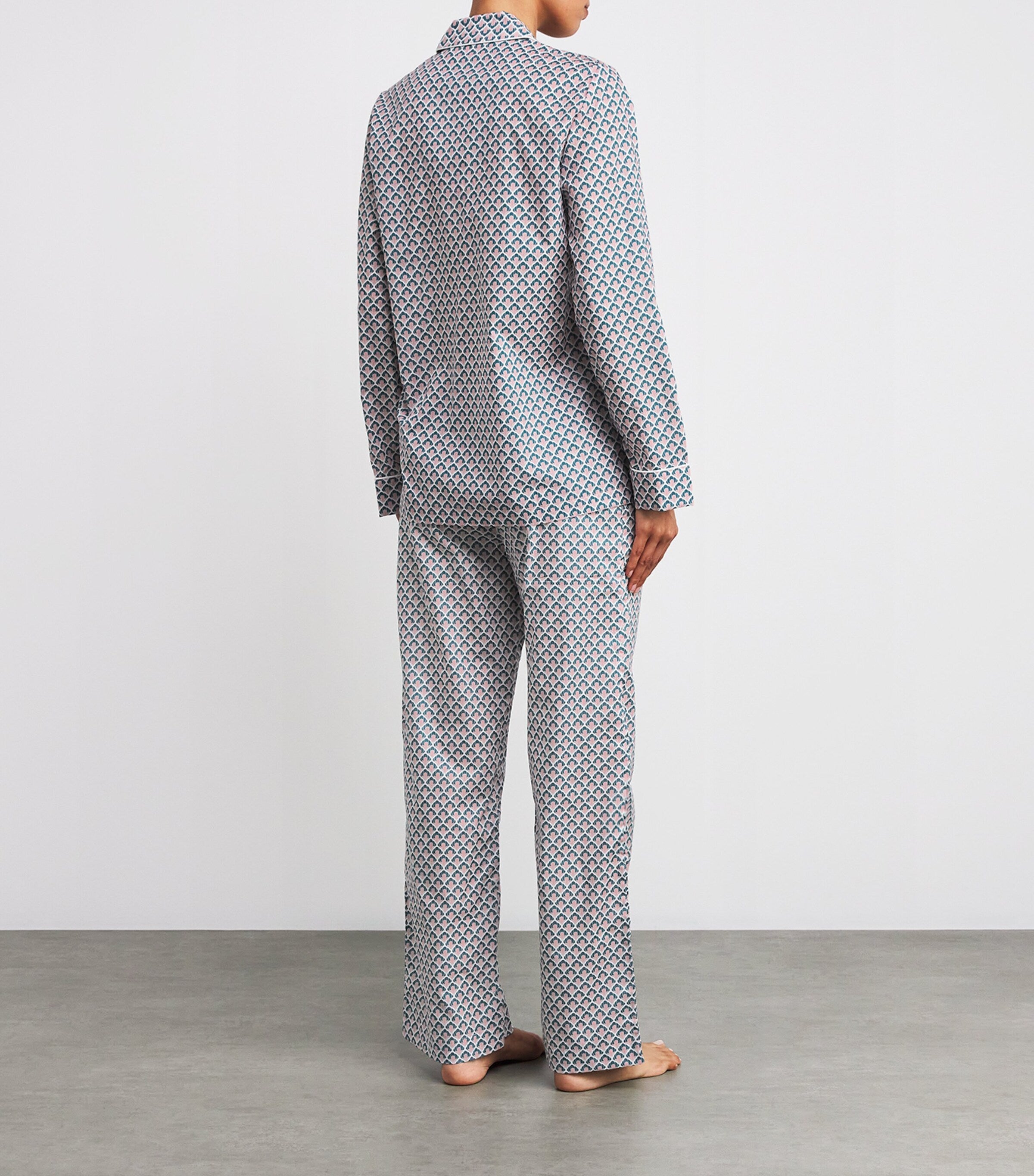 Adorned with a soft-focus seashell print, this Derek Rose lightweight cotton set brings a whisper of the coast to bedtime rituals. Featuring a breezy button-up shirt and matching trousers, it’s made for dreaming of tides and tranquil shores.