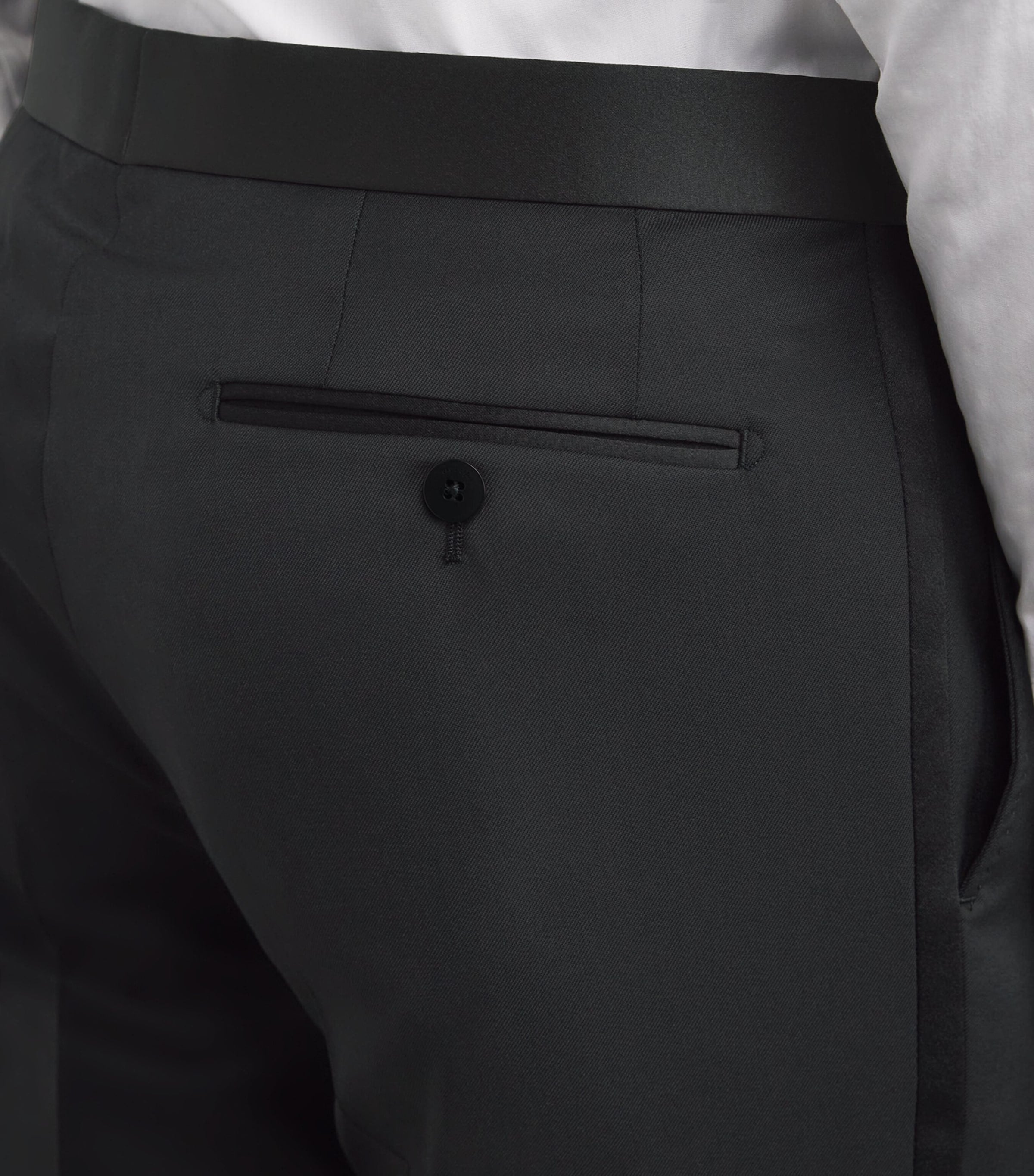 Pal Zileri's Vicenza fit reflects its blend of heritage and modernity, tapering in its trousers while maintaining the lines of traditional tailoring. This tuxedo from the line is crafted from pure wool with classic satin trims, completed with peak lapels, sculpting darts and flattering pleated legs.