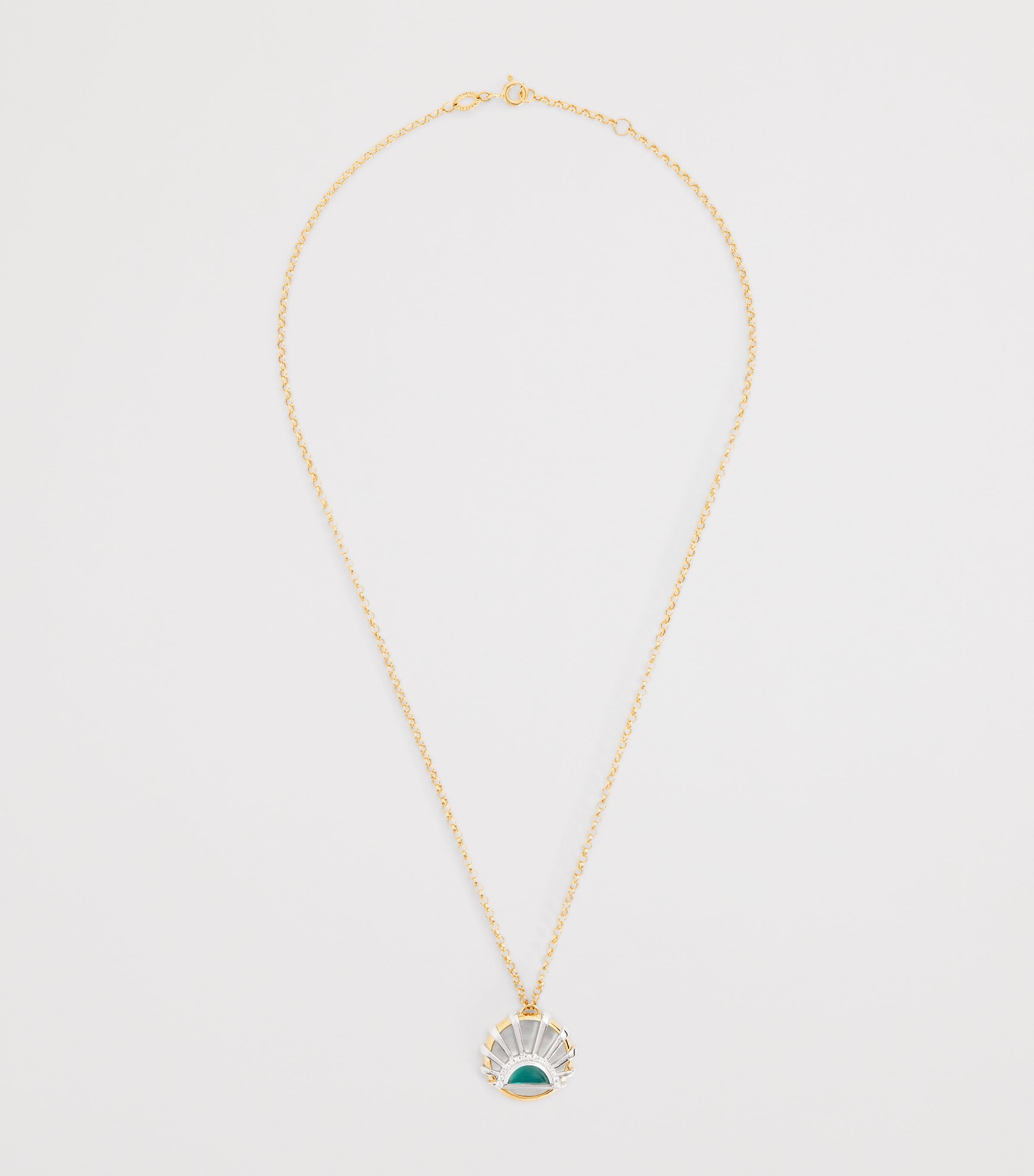 L’atelier Nawbar’s penchant for rich storytelling comes to life in the N*93 collection, which imagines a jetsetter in the 1990s travelling to auction houses to collect rare treasures. As if plucked from a vintage jewellery box, the Sun Dawn necklace is imagined in polished 18-karat yellow gold and depicts a rising sun through diamonds, green topaz and mother-of-pearl inserts.