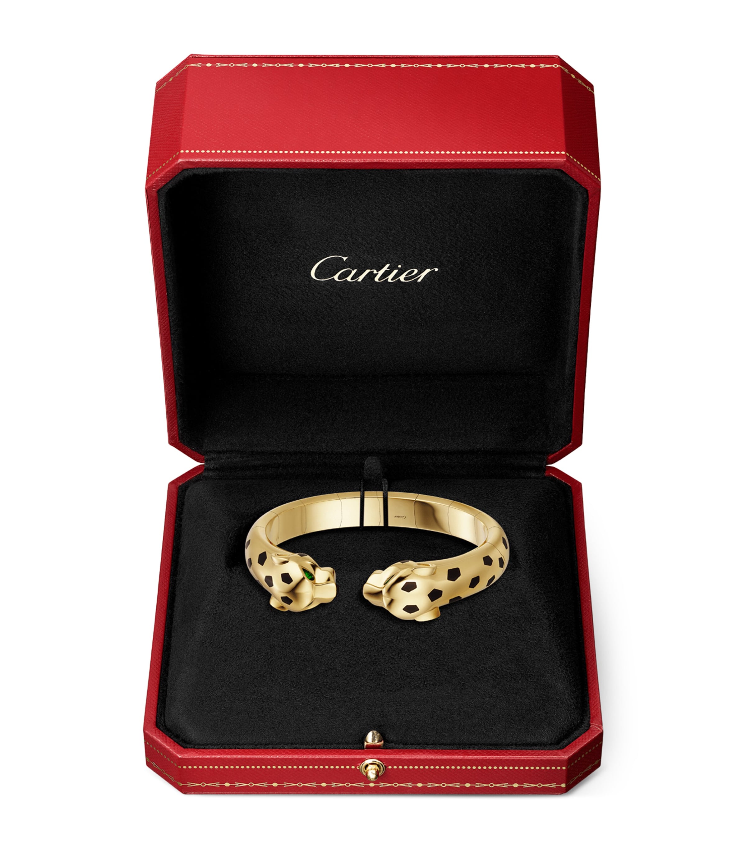 Since its first appearance in Cartier collections over a century ago, the panther has become one of the most important motifs for the French jeweller. At once both fierce and elegant, the big cat wraps itself around the wrist in the 18-karat yellow gold Panthère de Cartier bangle, detailed with gleaming tsavorite garnets for eyes, black lacquer depicting its spotted coat and onyx at its nose. Slip it onto your wrist when you're in need of a little talismanic protection.