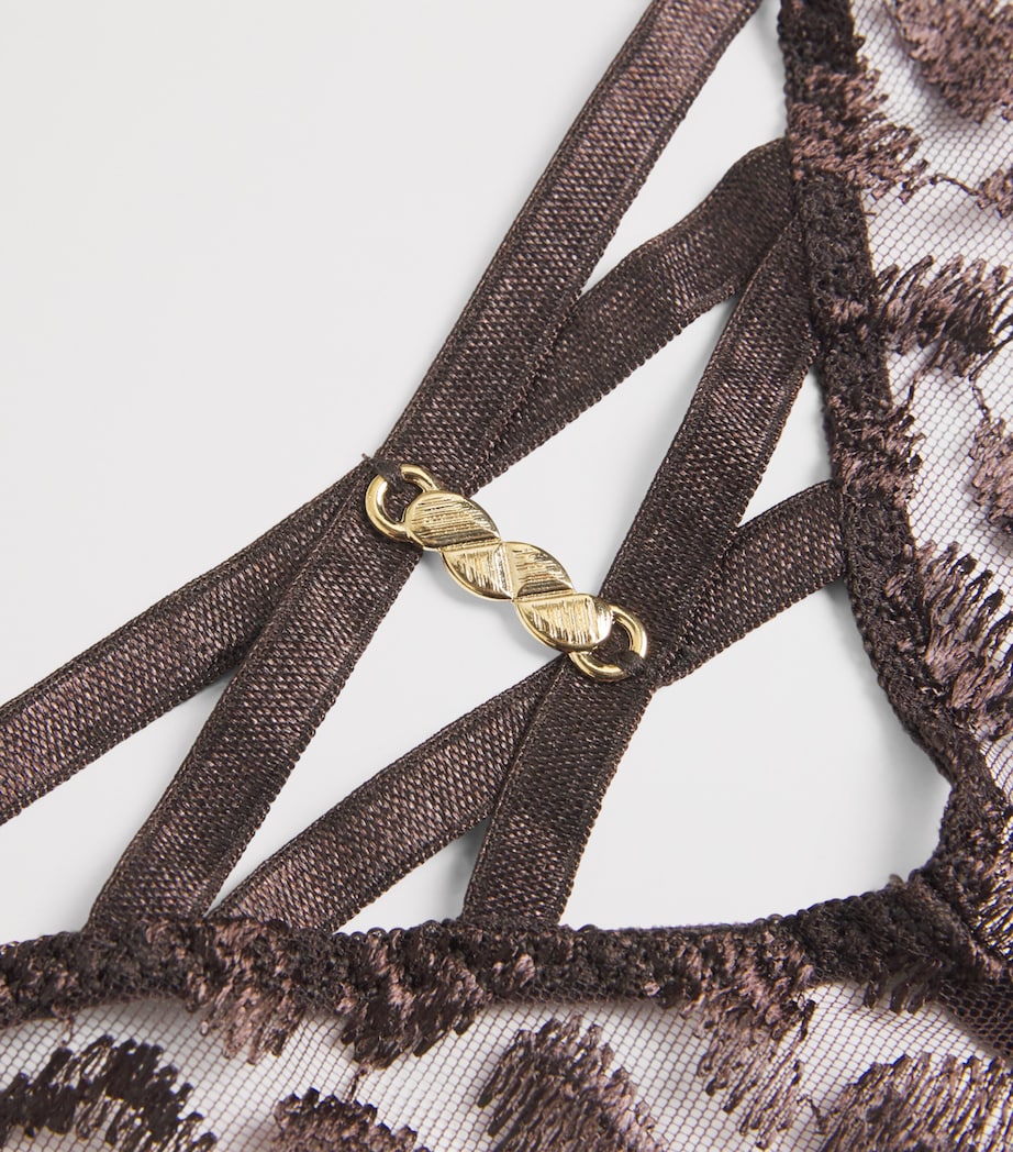 With a history dating back to the 1950s, Aubade has remained a coveted name in lingerie thanks to its adventurous silhouettes and romantic Parisian style. Defined by its striking animal print embroidery, the Crazy in Love collection flatters with shimmering, iridescent details. Adorned with gold-tone charms, these briefs are the perfect complement to the matching suspender belt.