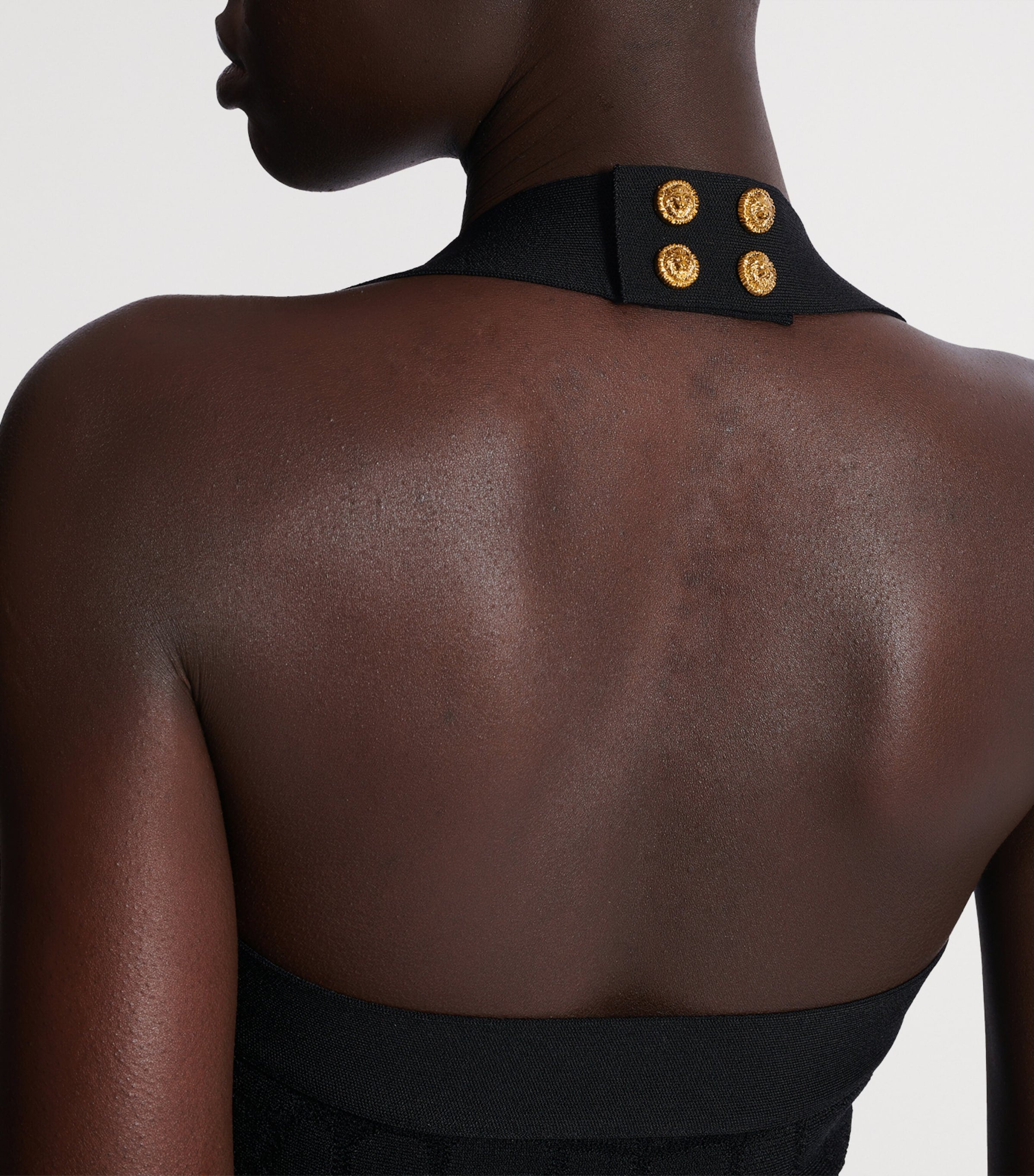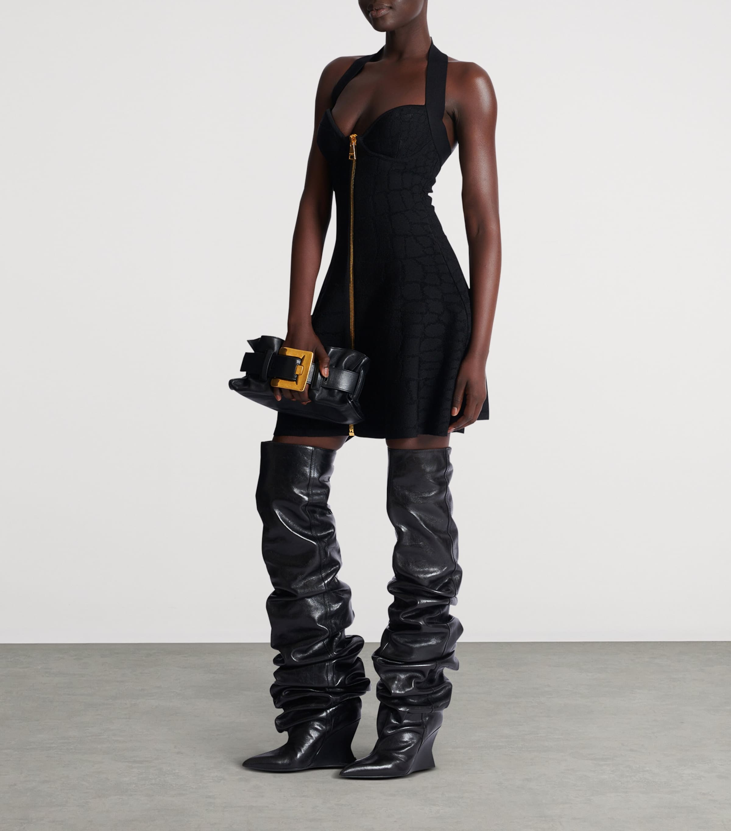 Balmain displays its technical prowess when it comes to material manipulation with this halterneck mini dress. Not only is the design accented with oversized, gold-tone hardware – a signature aesthetic of this Parisian label that here takes the form of a zip – but the knit overlay is finished with an effect modelled on crocodile skin.