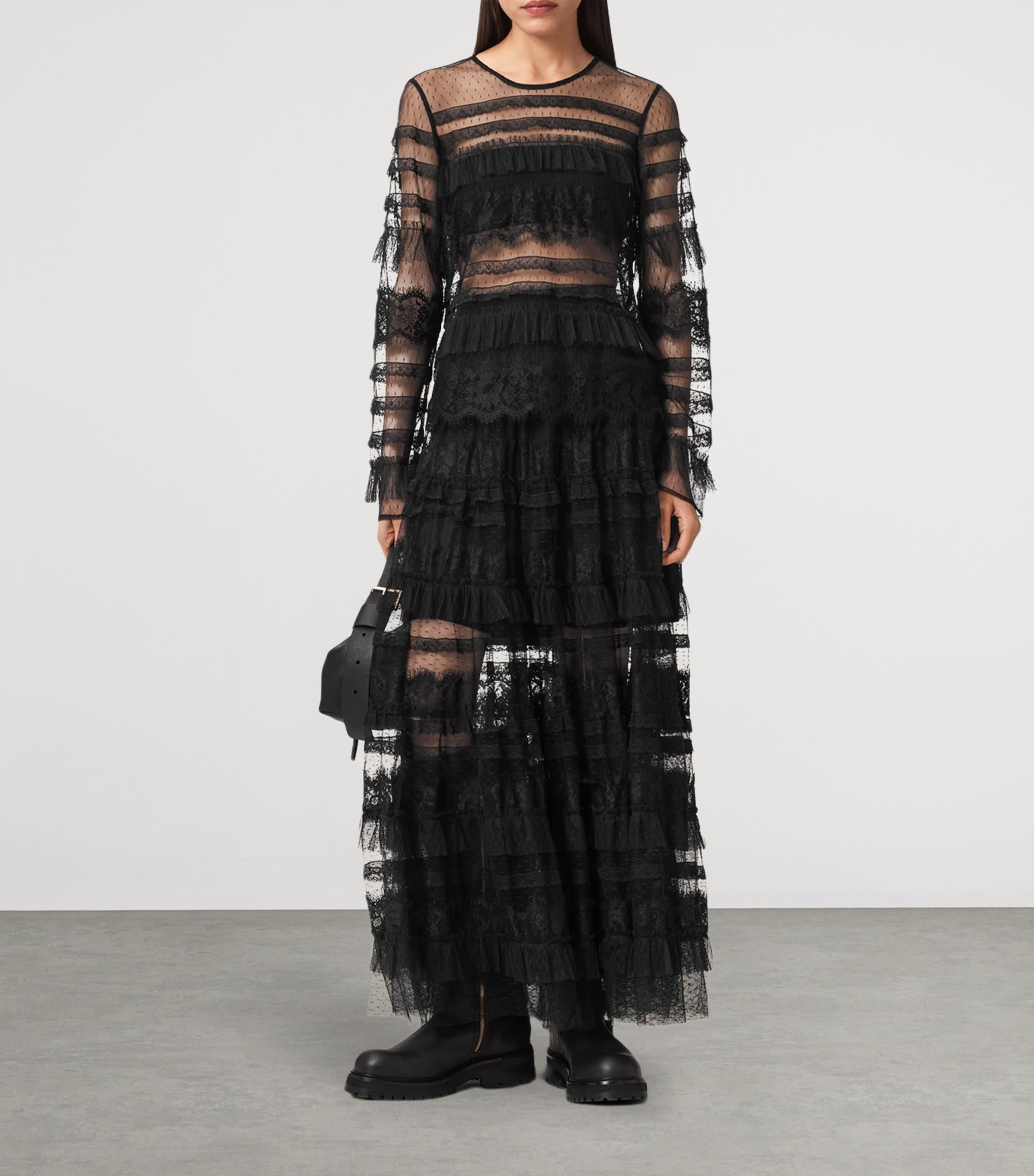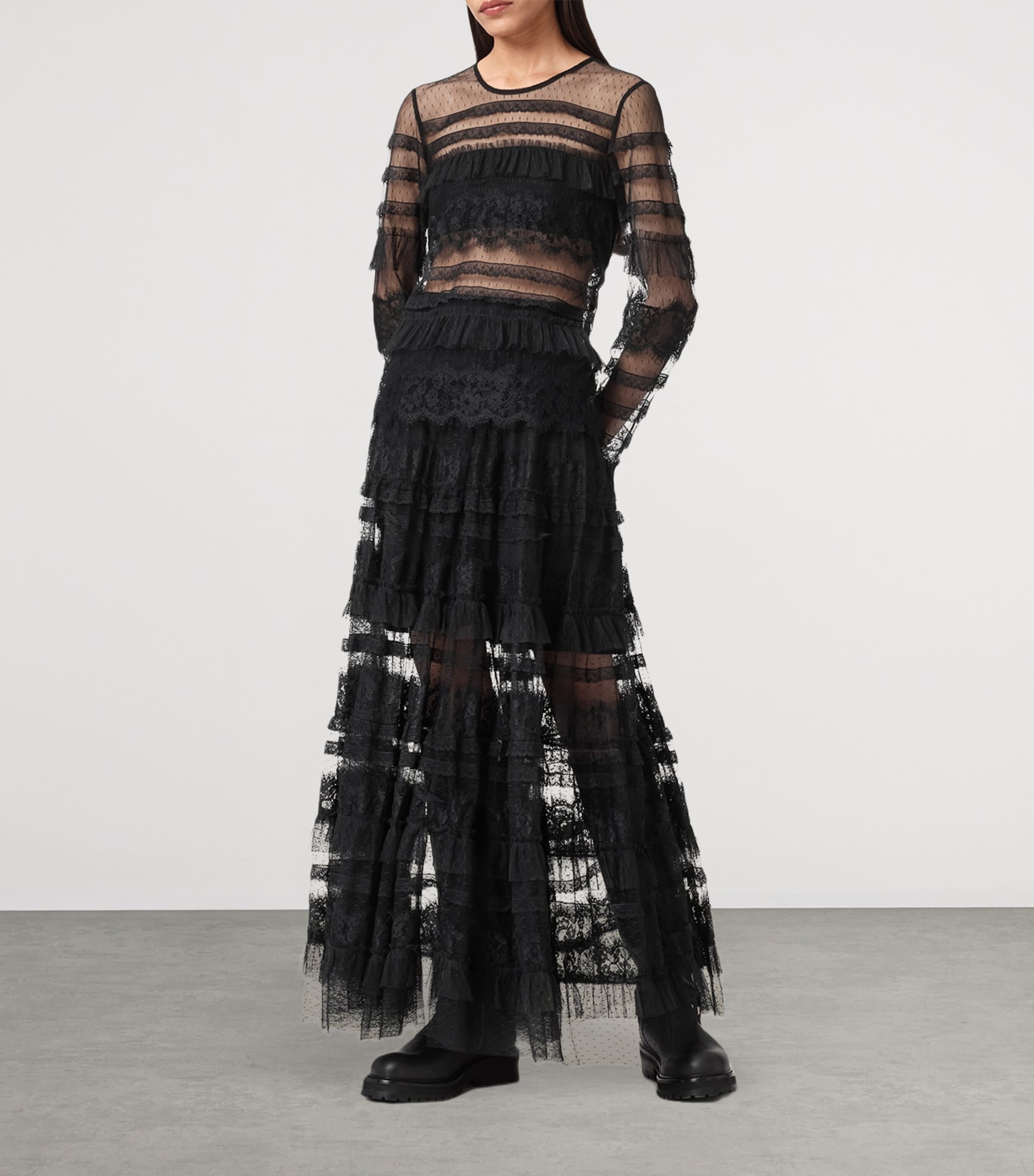 The Arlea skirt by AllSaints is reimagined in a sheer mix of dotted tulle and lace, creating a layered, romantic feel. Finished with a branded elastic waistband, it pairs diaphanous texture with just the right amount of edge.