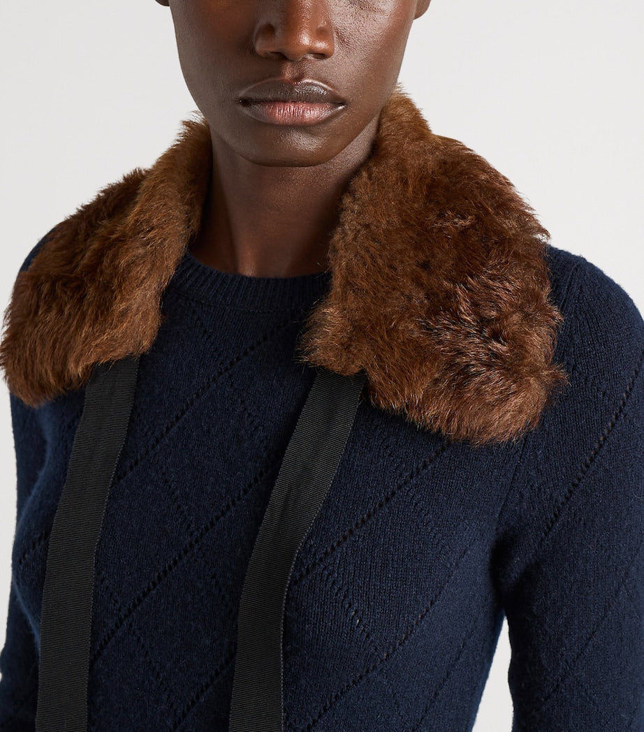 Embrace the enveloping warmth of cashmere while looking smart in this knitted midi dress by Prada. The long-sleeve silhouette is completely pared back in terms of adornments, save for an open-knit diamond pattern inspired by Argyle jacquards.