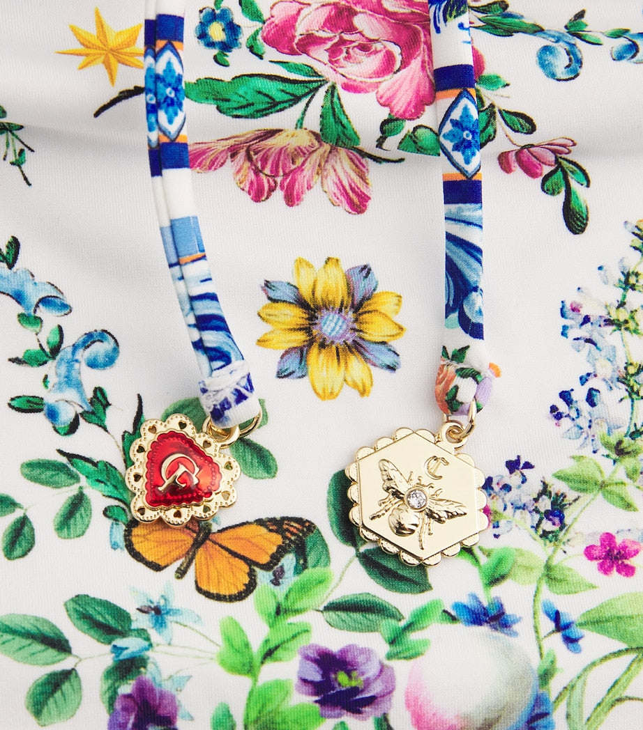 Fine crystal embellishments are sure to sparkle under the sun. Inspired by the travels of the eponymous founder, Camilla’s signature prints celebrate culture, taking you to new places with every wear. The Tiles Darls motif is a display of vibrant florals and titles in an ode to artisanal craft, showcased on this ruched underwire swimsuit among shining crystal embellishments.