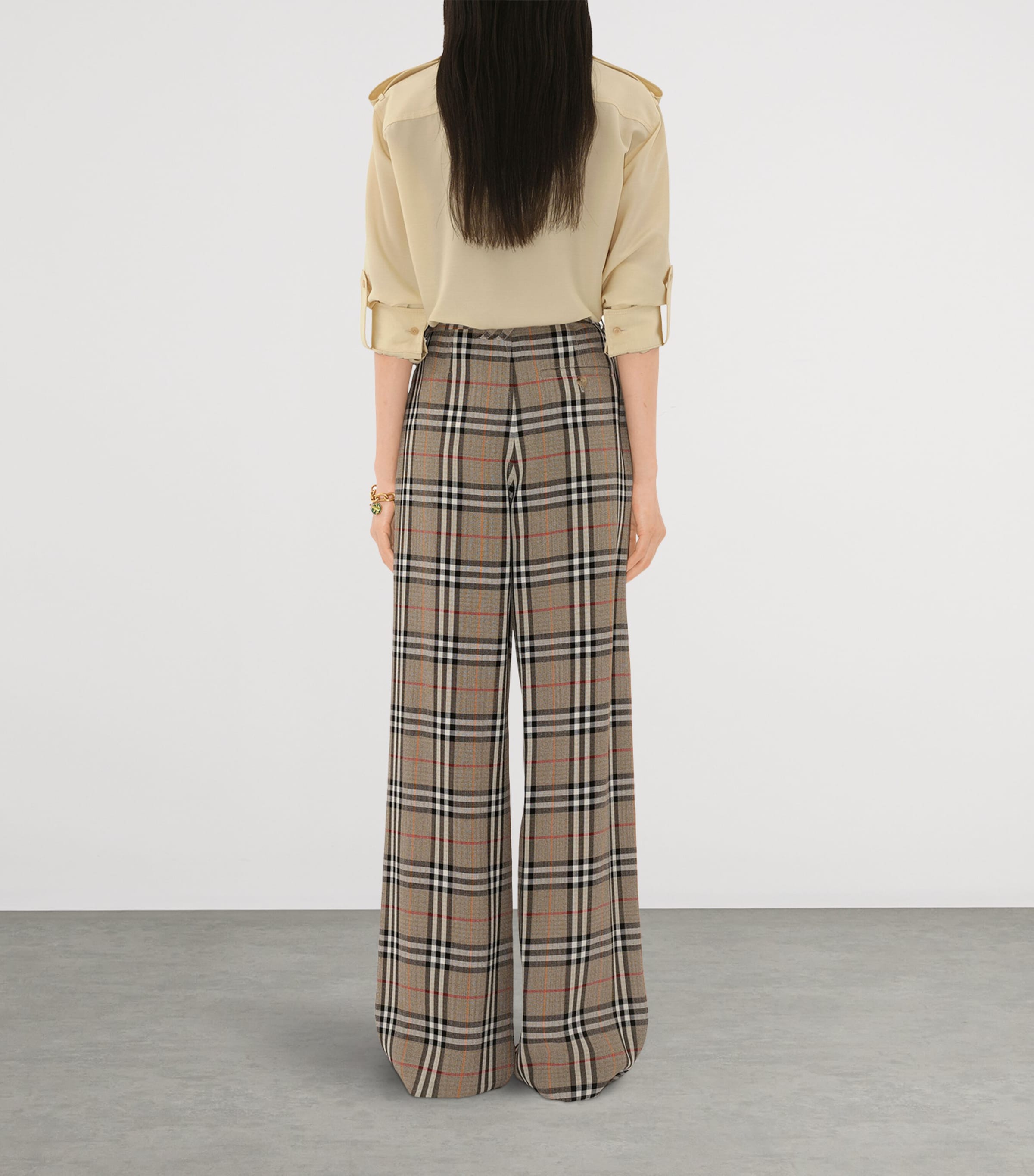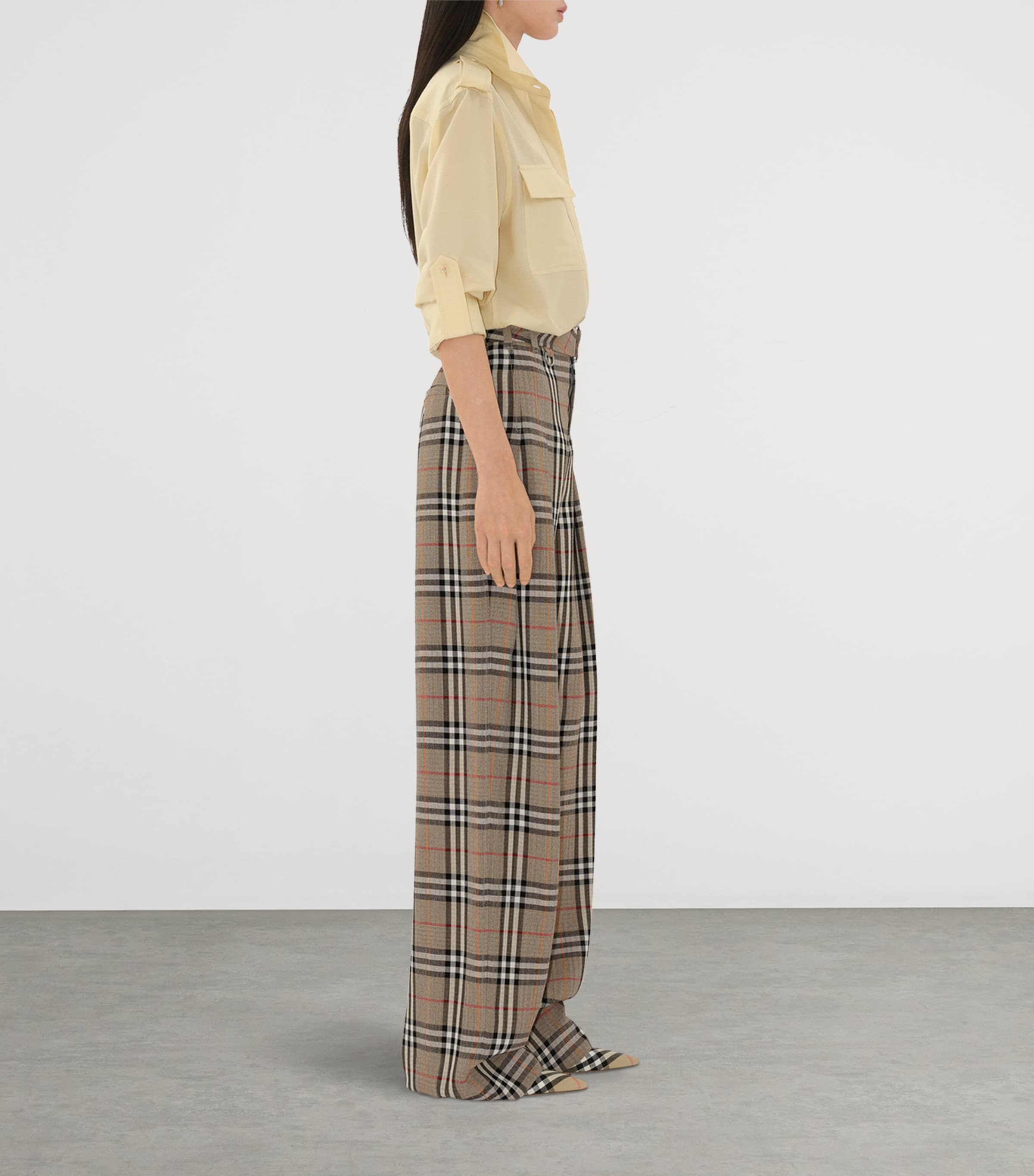 Once adorning the lining of Burberry’s iconic trench coats, the Burberry Check is reimagined here as an elegant pair of wide-leg trousers. A draped belt brings movement to the waist, while a touch of silk woven into the fabric adds a lustrous finish that speaks to the House’s commitment to quality.