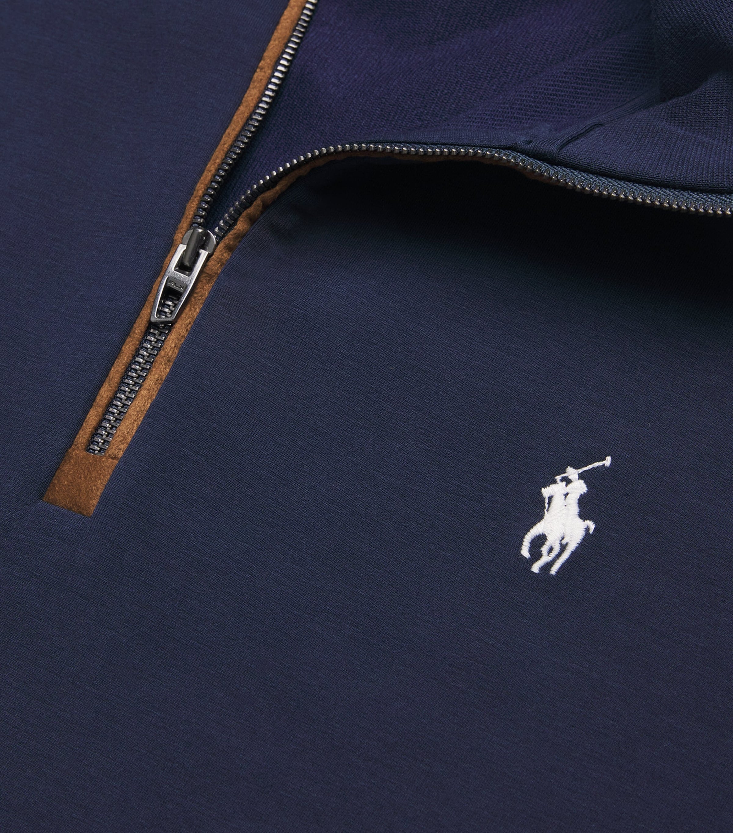 Crafted from a cotton-blend stretch French terry, this quarter-zip sweater from RLX Ralph Lauren balances ease with performance. Its water-repellent finish offers protection in shifting conditions, keeping you dry in a drizzle, while rib-knit trims and faux suede detailing at the placket refine the look.