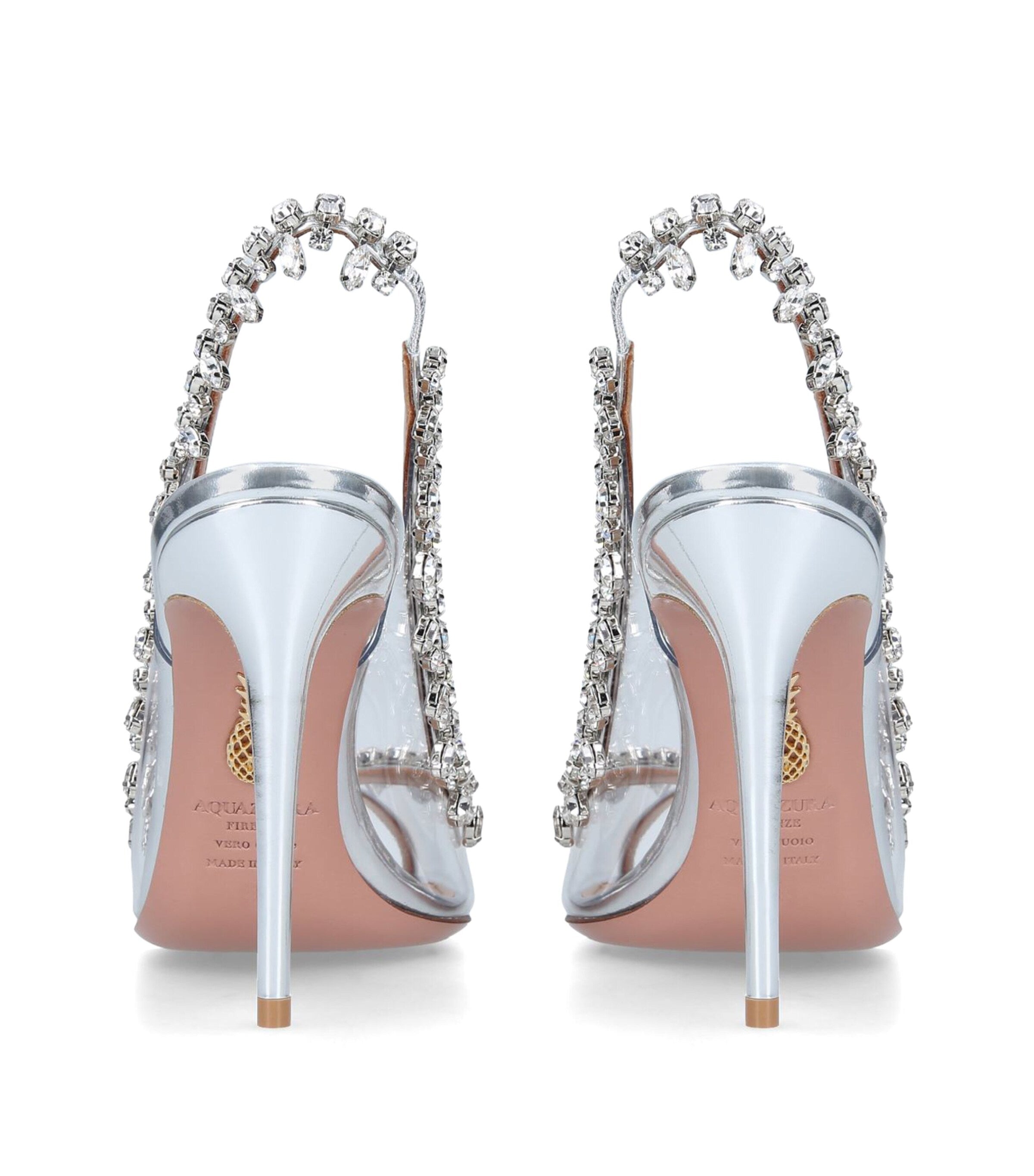 Captivate your audience in a pair of Aquazzura Temptation sandals. Made in Italy from supple nappa leather, the style features PVC illusion panels, set on a slim, high heel and adorned with dangling crystals. Flaunt them with a classic little black dress for instant glamour.