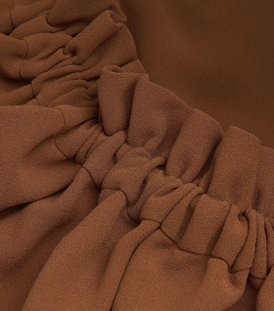 Edeline Lee’s Ruff blouse achieves its feminine neckline through clever, unconventional means. An elasticated circumference ensures a custom, comfortable fit, gathering the fabric evenly all the way around.
