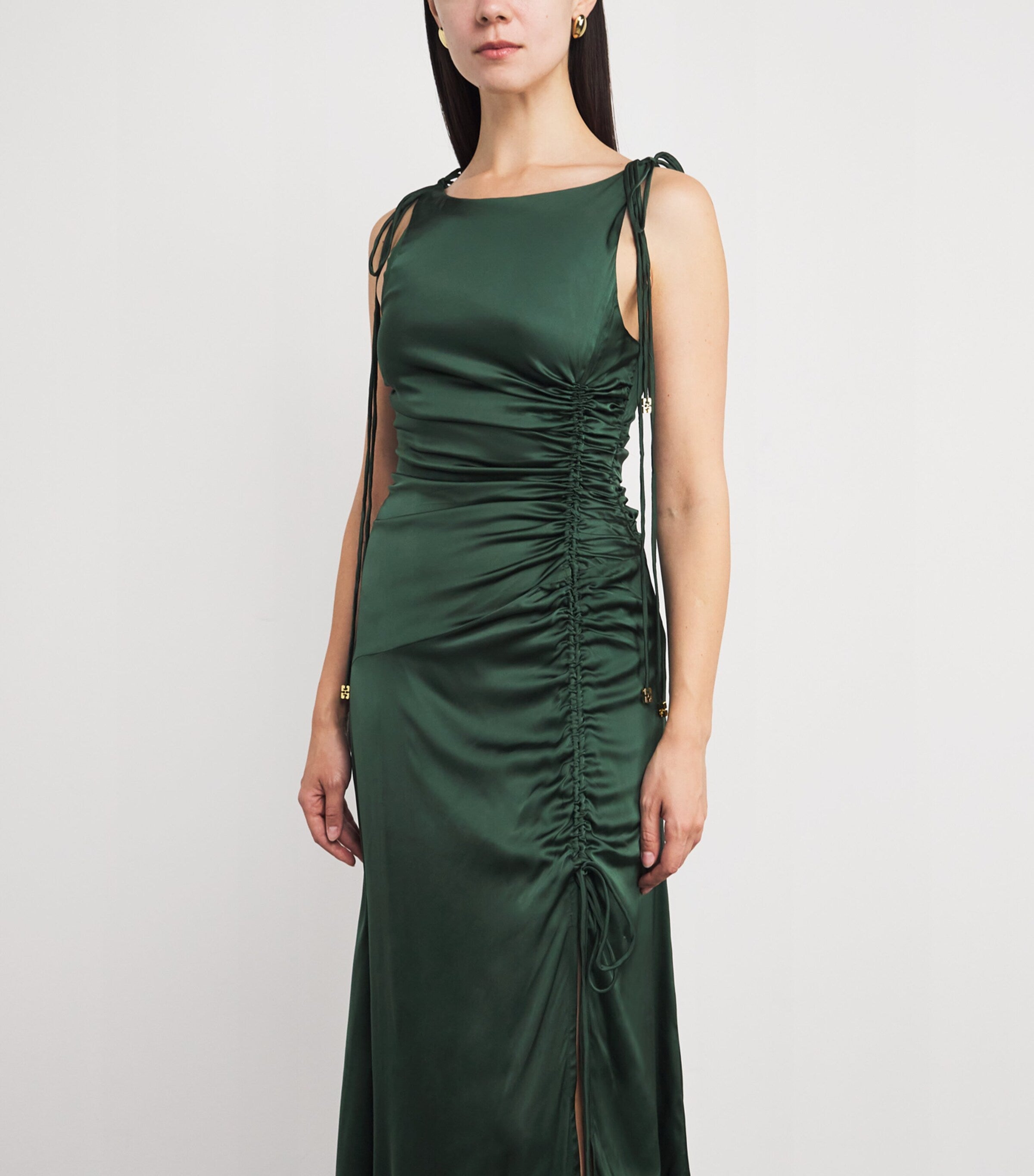 GANNI Green Satin Ruched Maxi Dress - 774 pineneedle / 32 FR
