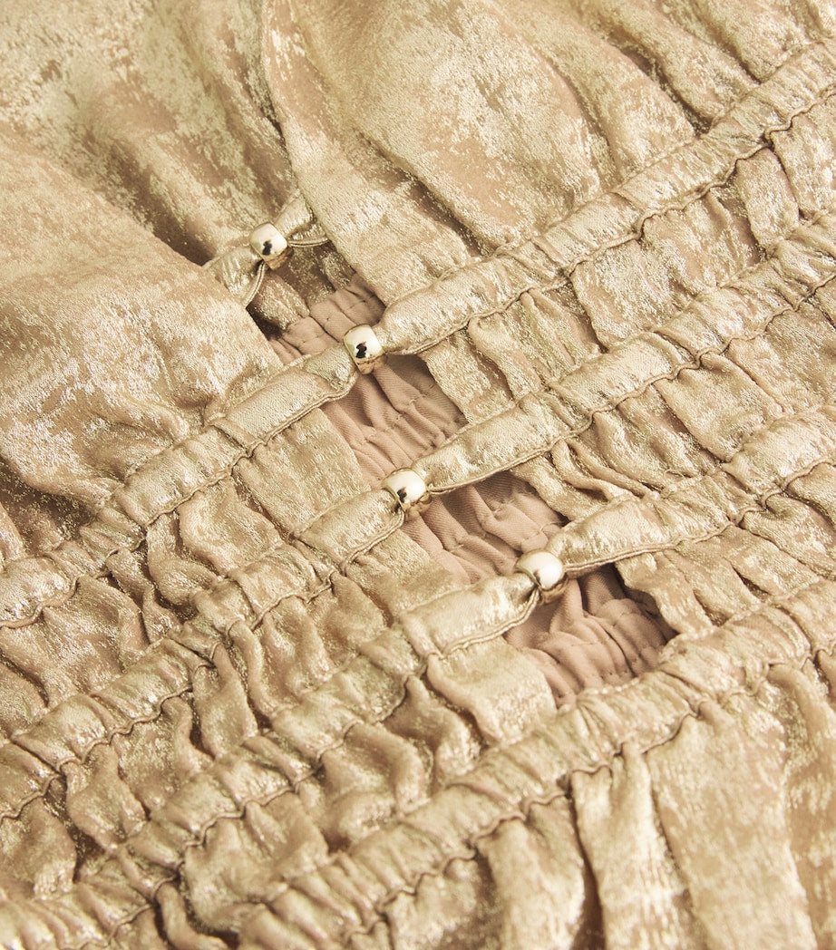 The glamorous Parisian it-girl of the 1970s is the seasonal muse for Maje’s latest capsule of wardrobe staples such as this midi dress. Likely to be seen shimmering during the sun-filled days and after-dark escapades, the style elegantly flows down the body with a gathered skirt to allow the folds along the lamé to beautifully catch light in motion.