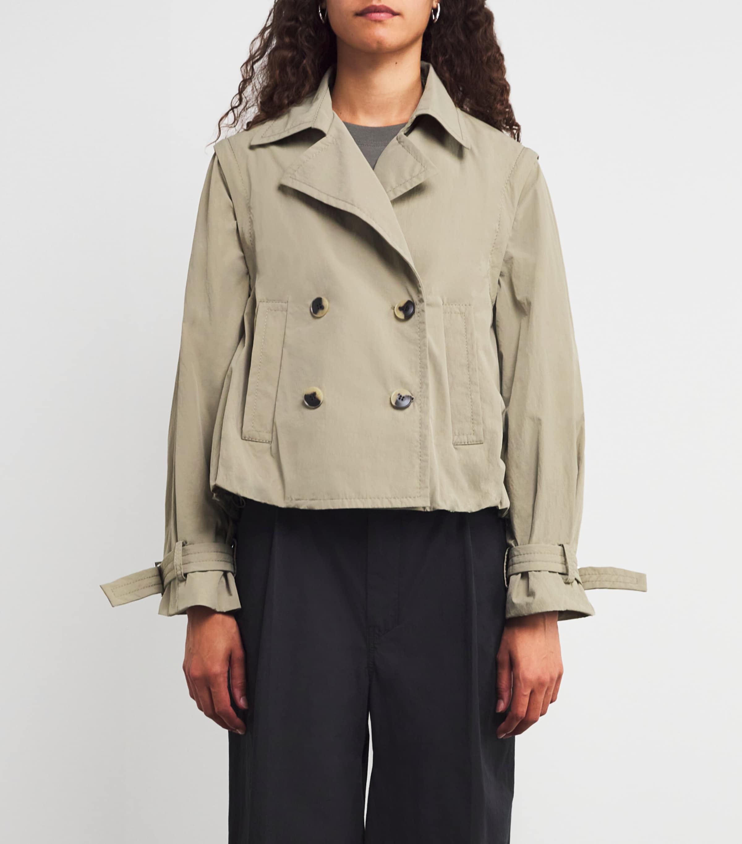 Although dating back to 1986, MAX&Co. keeps a fresh perspective at the heart of its design philosophy. Here, it presents its contemporary outlook with this short pea coat, crafted from slub-textured, lightweight nylon to a double-breasted silhouette that can be transformed into a gilet via zips at the shoulders.