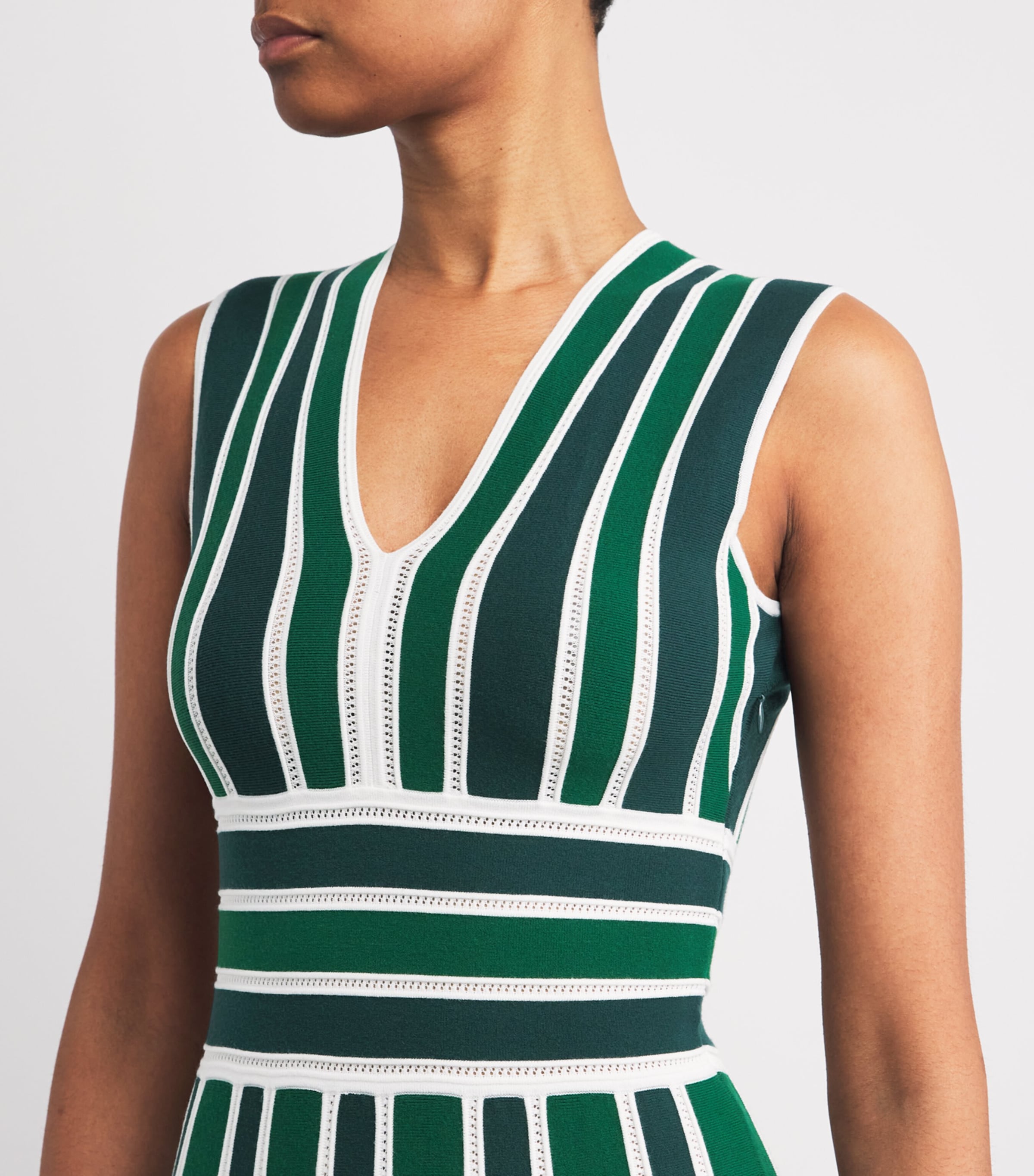 Max Mara has long used pattern and graphics as a tool to accentuate its silhouettes. The Tallone dress, for example, utilises green and white stripes to trace the lines of its V-neck, fitted bodice through to the flowing midi-length skirt, with horizontal lines highlighting the flattering pointelle details.