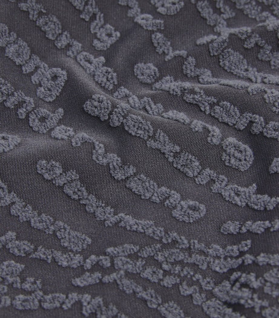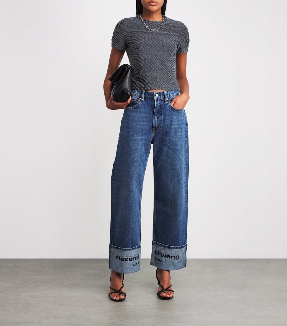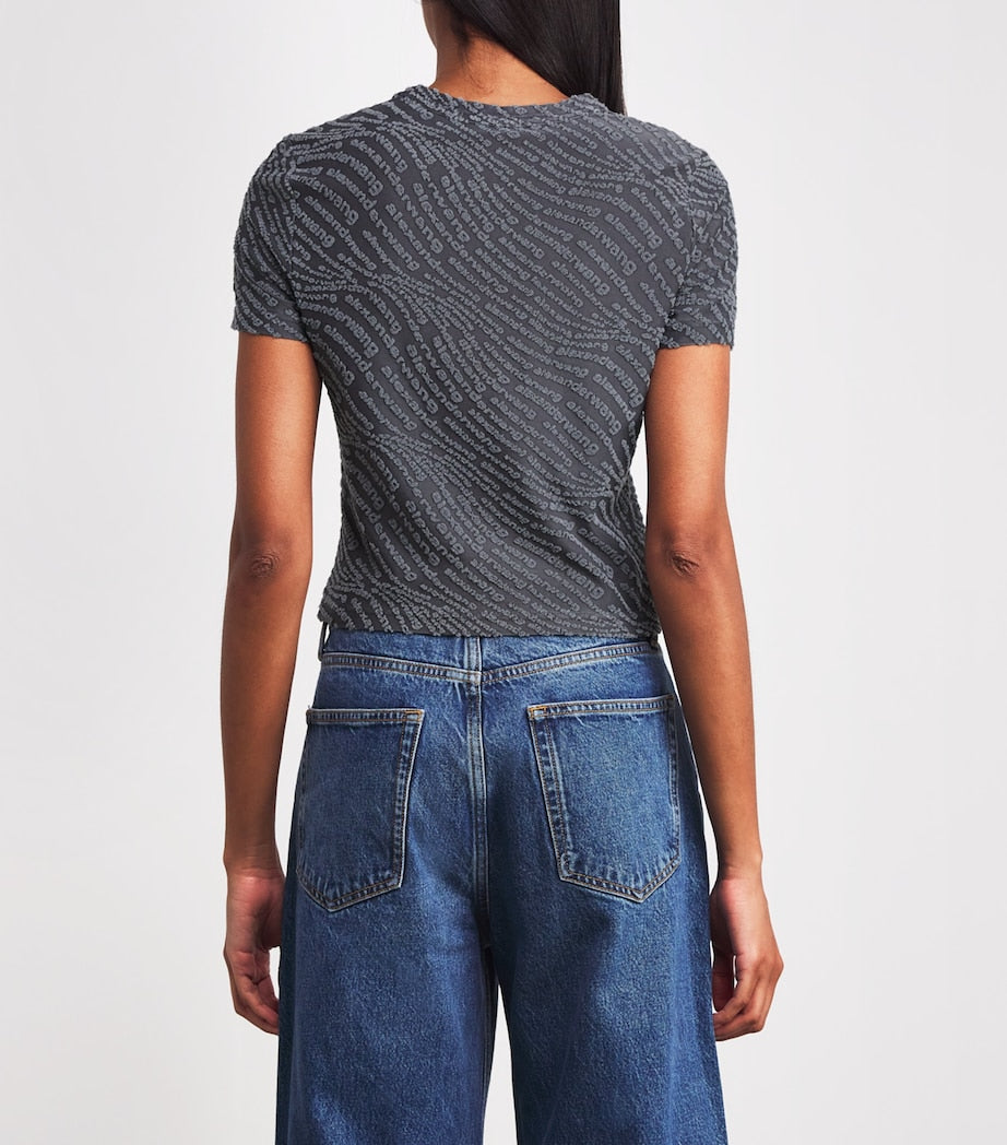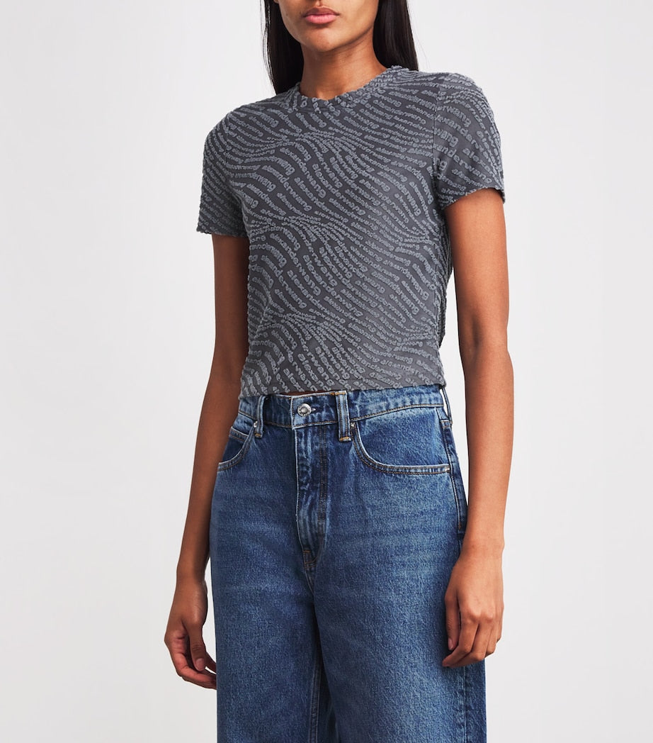 New York-based creative Alexander Wang brings together two of his favourite design qualities – texture play and logo motifs – in the creation of this T-shirt. The slim-fitting jersey bodice is splashed with a bouclé logo pattern in a hypnotising wave formation.