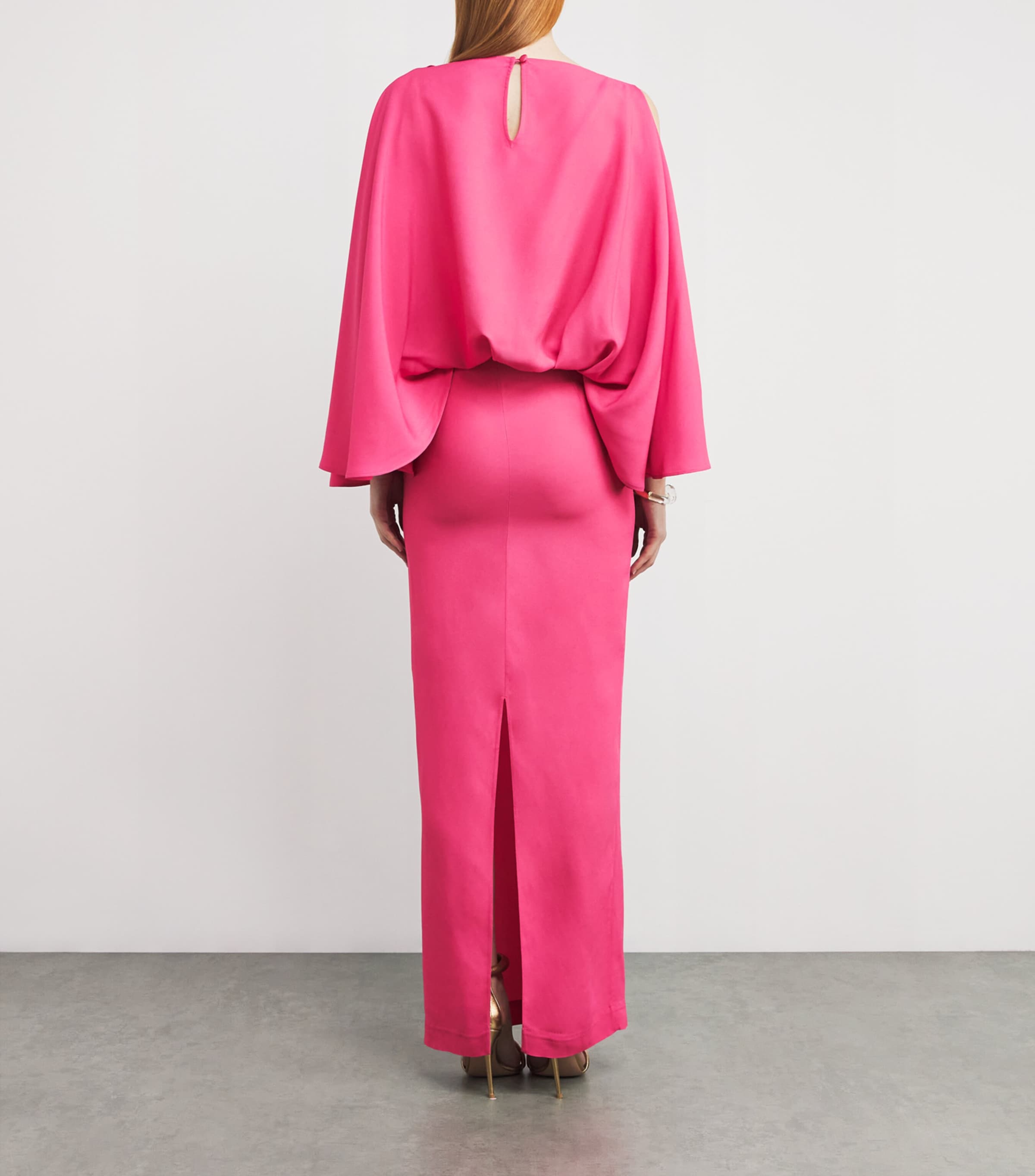 A dress of two halves. The La Maddalena dress demonstrates what Taller Marmo does best: fuse modest silhouettes and drapery to create something truly elegant. Crafted from a viscose-blend crepe, it features an oversized blouse top, with open-cuff detail sleeves that juxtapose with the sharp, column skirt that falls to the floor beneath.