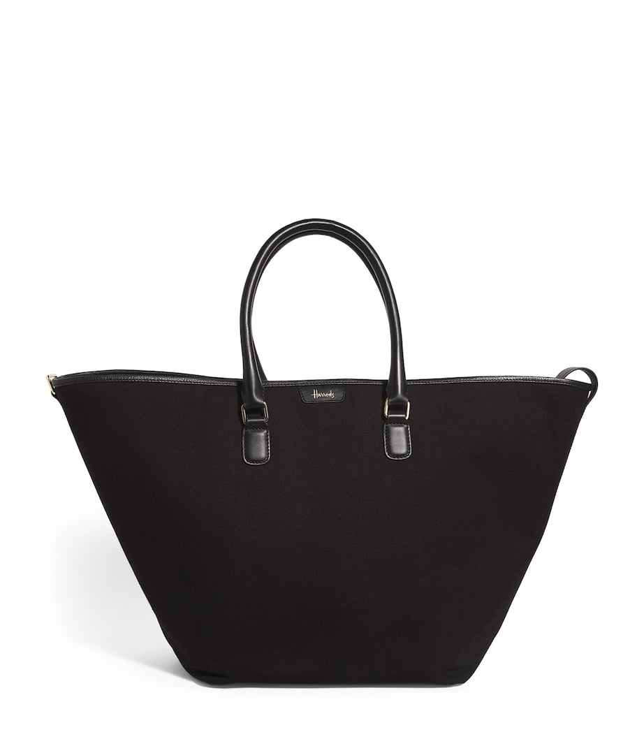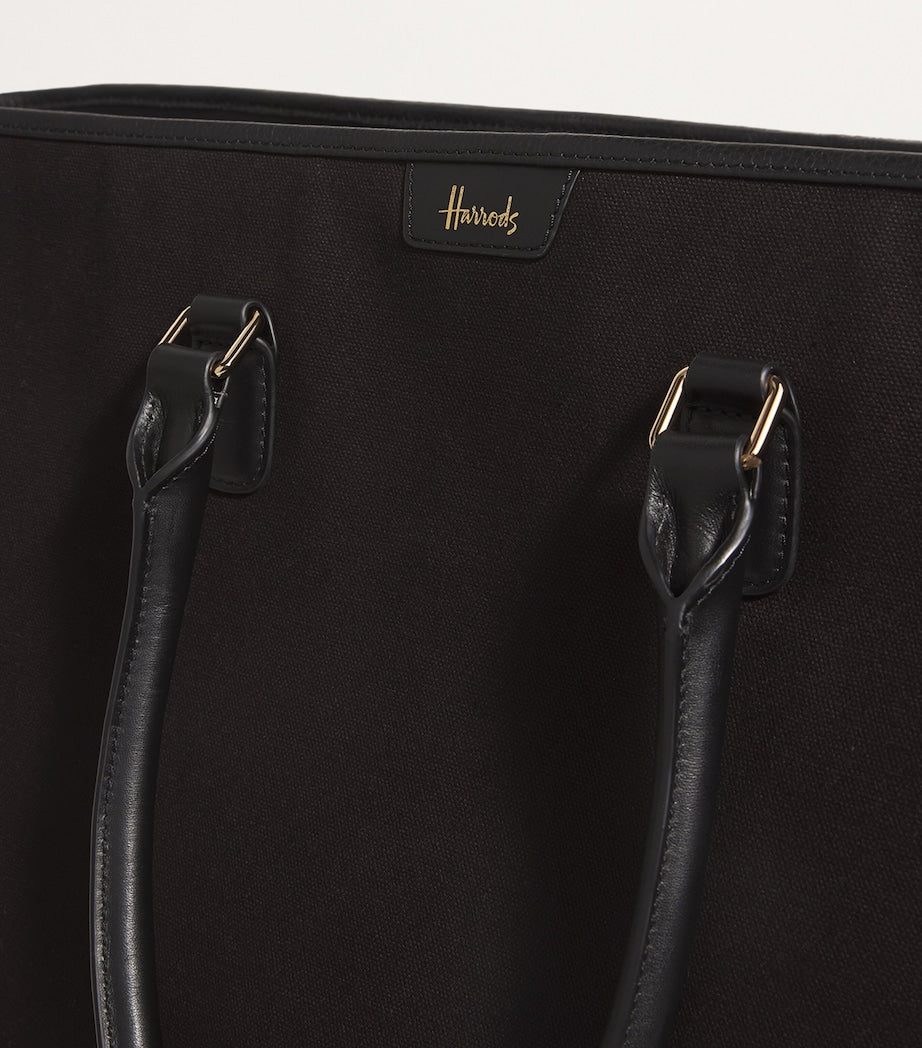 A sophisticated addition to your accessories repertoire, this Harrods tote bag blends smooth cotton canvas with intricately stitched leather trims. Perfectly sized for your everyday essentials and exuding an air of timeless style without sacrificing function, it showcases its origins with our gold-tone moniker – a detail that only elevates it further.