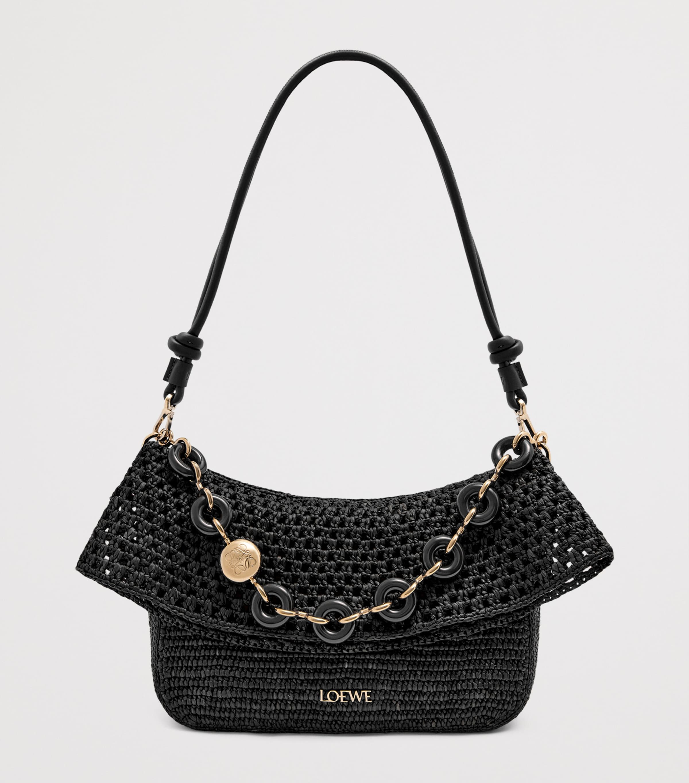 Having designed many iconic carriers, LOEWE proceeds to release yet another one in the face of the Ola shoulder bag. Characterised by a doughnut chain that spotlights the signature Pebble hardware, the style is shaped from raffia to a curved fold-over body exemplary of the House’s linework mastery.