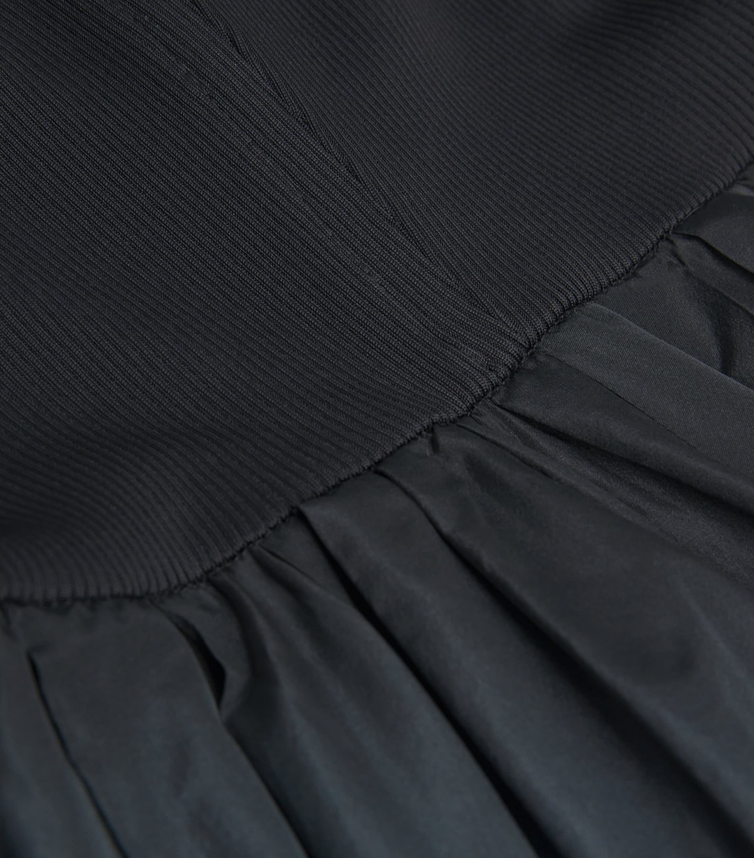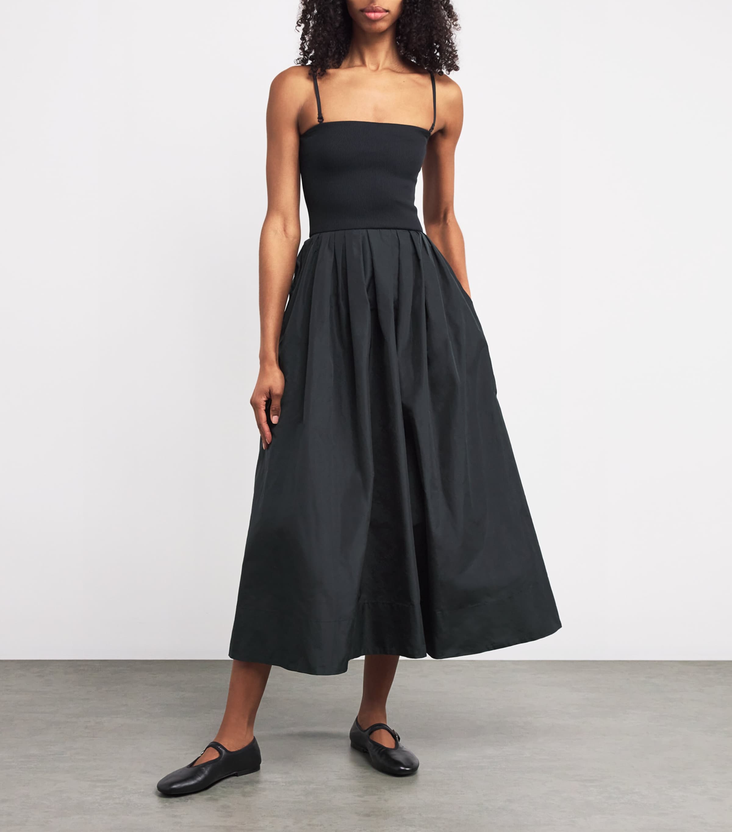 Bring an effortless elegance to evening events with this strapless midi dress from Parisian label Maje. The stretch knit bodice hugs the figure then fans out to a voluminous taffeta skirt that will add a healthy dose of drama to every room you walk into.