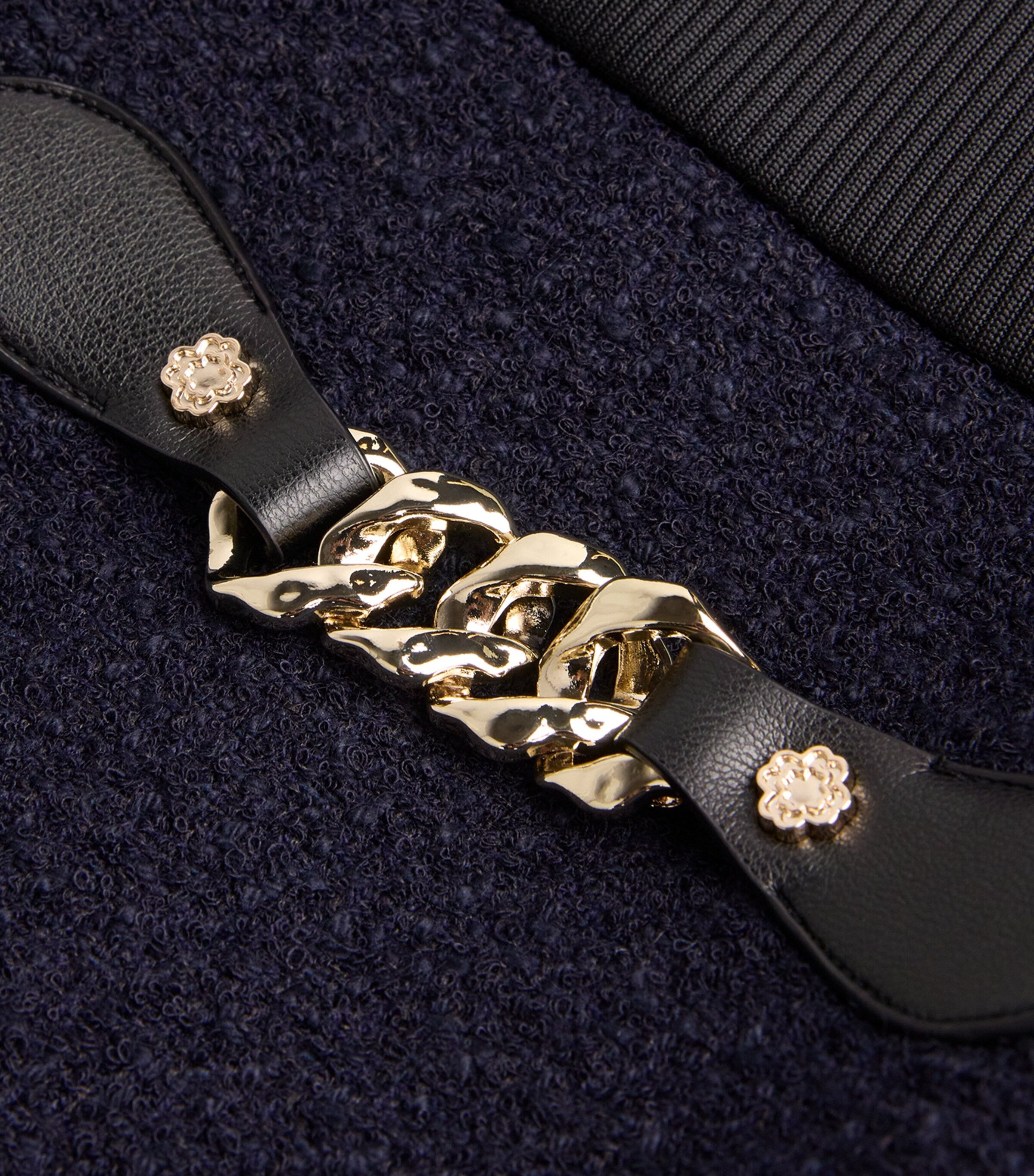 Maje utilises a fabric that's synonymous with French fashion. While tweed has an ancient history in menswear, it first rose to prominence in womenswear through the French fashion world of the early 20th century. Here, Maje nods to that legacy with a tweed two-in-one mini dress, featuring a flattering cape-like double-layer bodice, flared skirt and outdoor-coded, leather-trimmed chain detail.