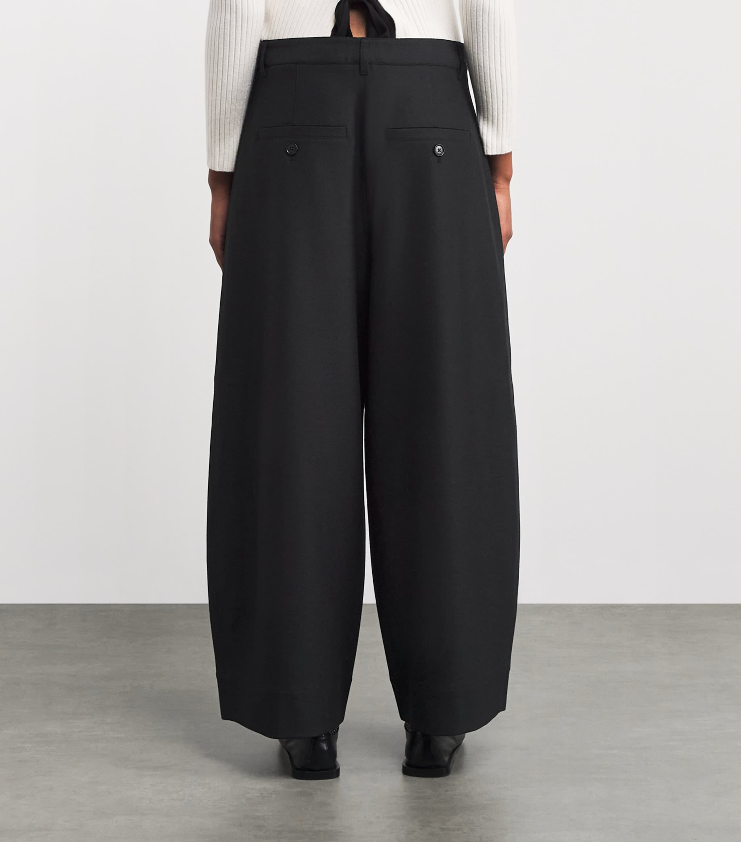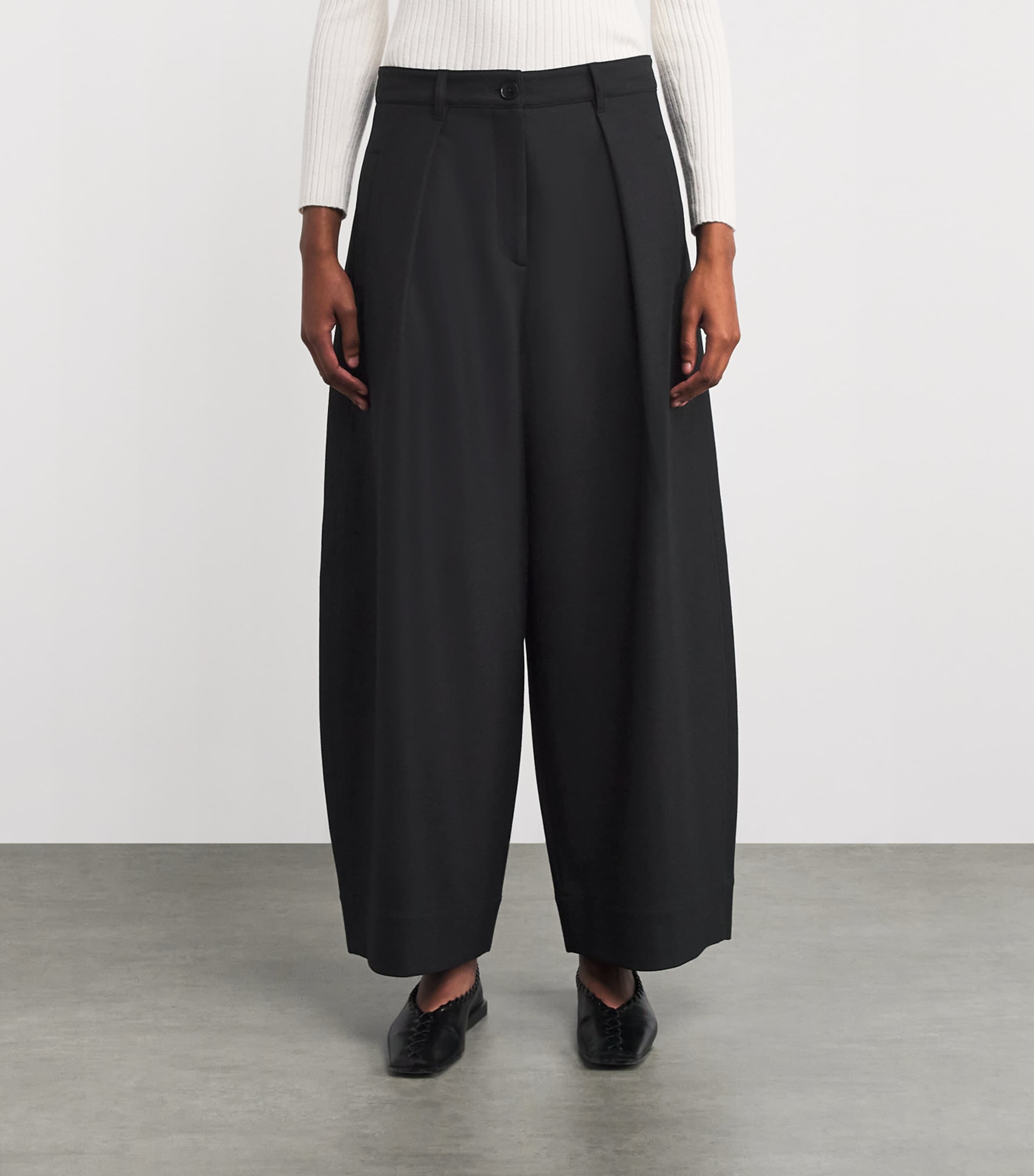 Draped to sophisticated perfection, this pair of trousers from ME + EM encapsulates the British brand’s ethos of 'flattering and functional' with amplified proportions. Designed for a smooth fit over the hips, these flare into a wide stance through the legs, with exaggerated pleats for a statement finish.