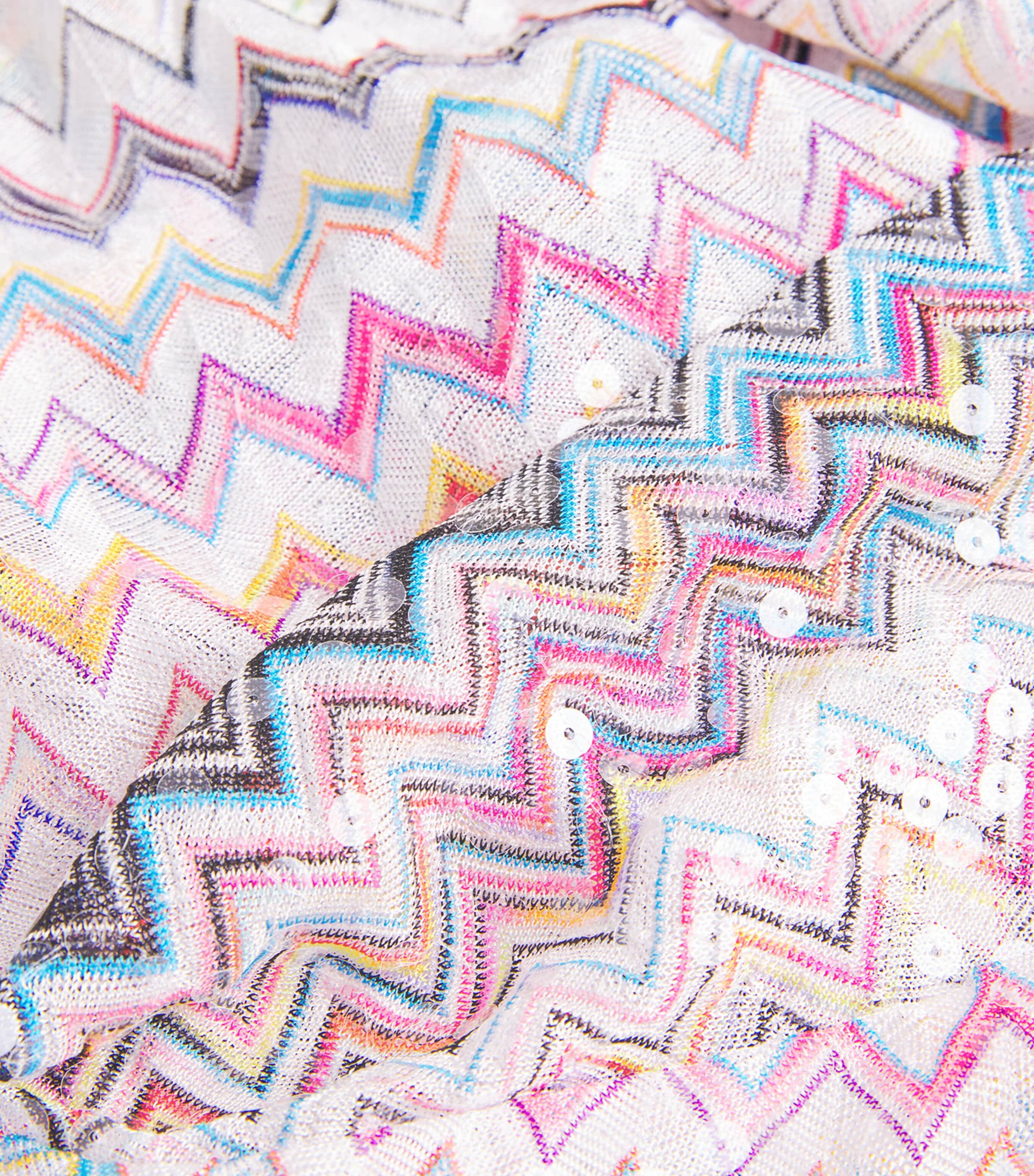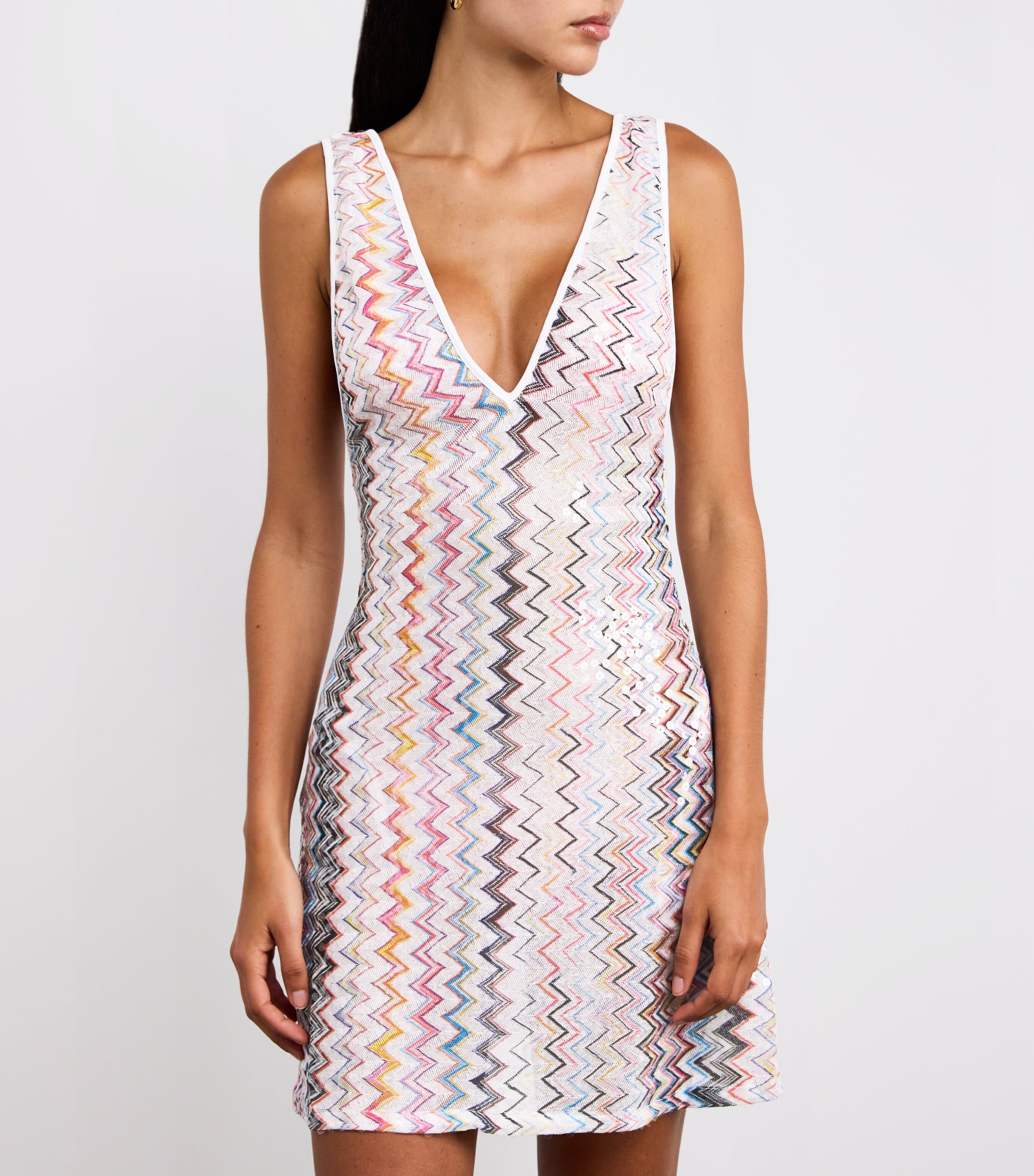 Famed for its zigzags, Missoni has been showcasing its knitwear savoir-faire since its founding in 1953. Today, the Italian label continues to look to its archives for inspiration. A case in point, this plunging mini dress spotlights the colourful knitted pattern amongst translucent sequins for a touch of shimmer.
