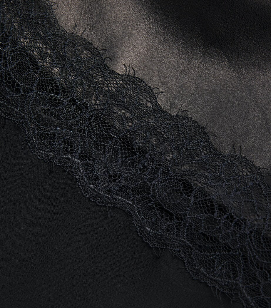 This pair propels traditional design codes into the future. Trust Nensi Dojaka to push the boundaries of fabric and form. These hybrid trousers take the classic leather style into contemporary territory with fluid tulle wide legs, accented at the thighs with delicate black lace.