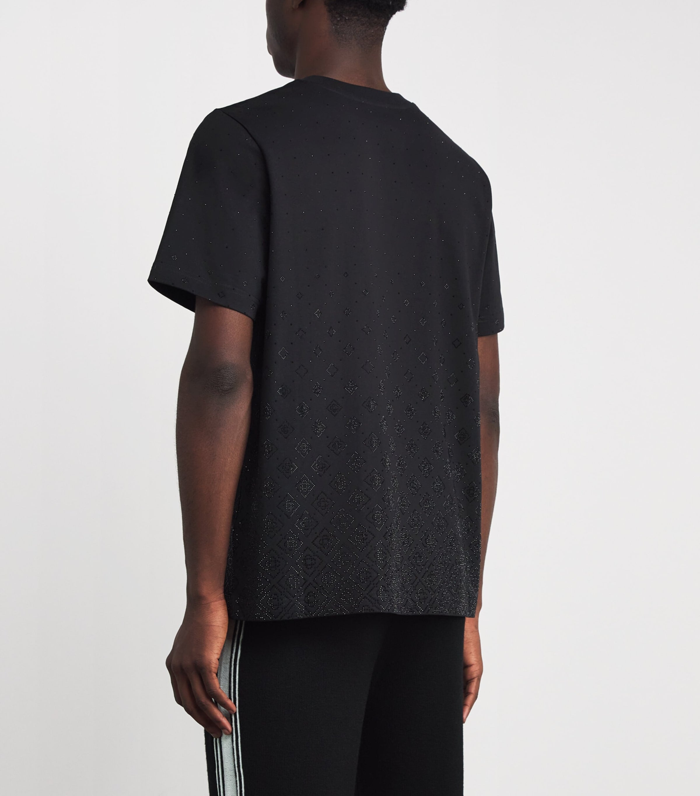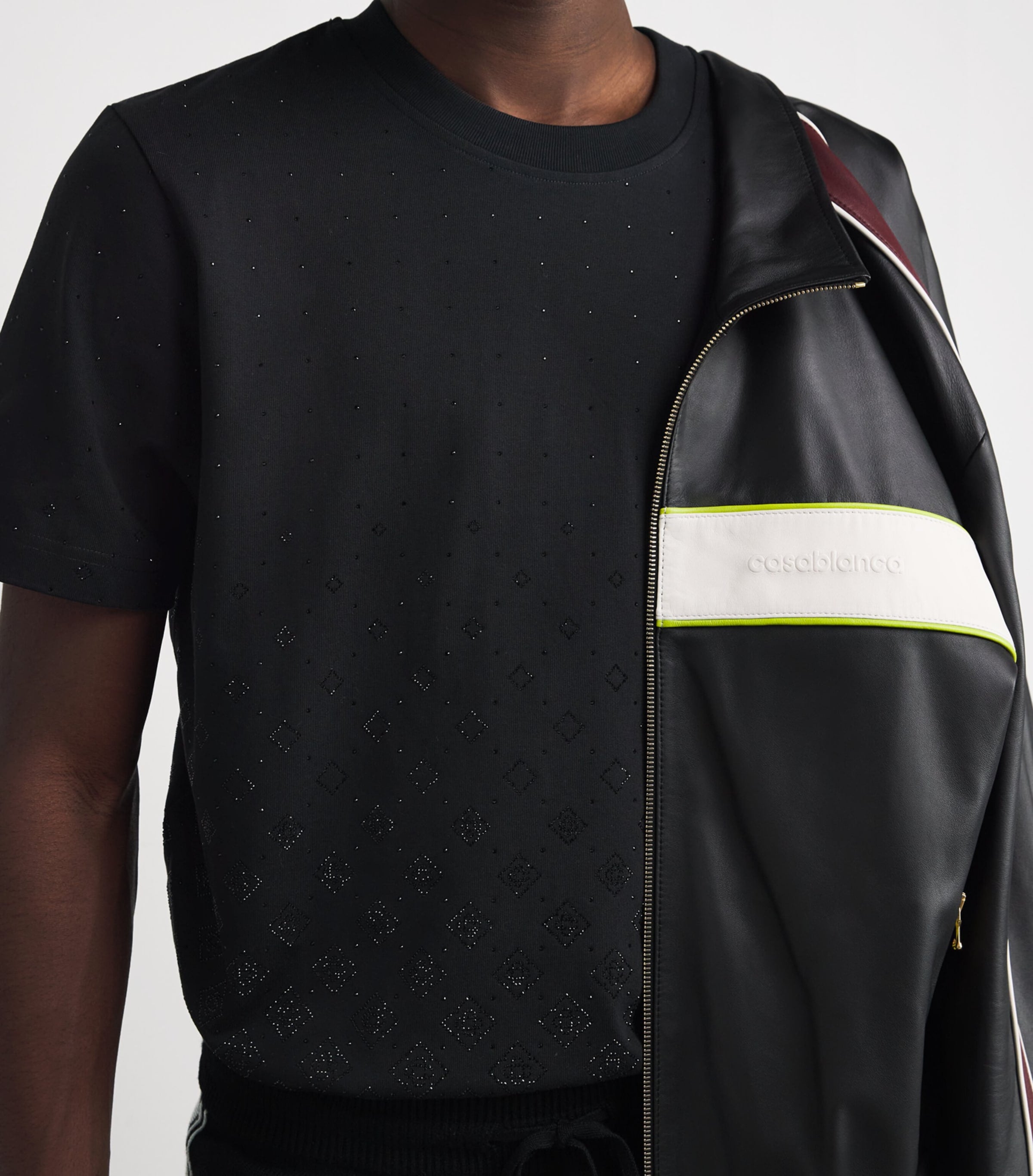 Casablanca's pieces have become ubiquitous in casual evening events thanks to their ability to convey motifs and branding in a tasteful, yet opulent manner. A case in point, this rendition of its signature organic cotton T-shirt features all-over crystal embellishment, forming a repeat monogram of its signature diamond monogram – at first glance, it'll appear plain, but as it catches the light, each piece will glimmer.